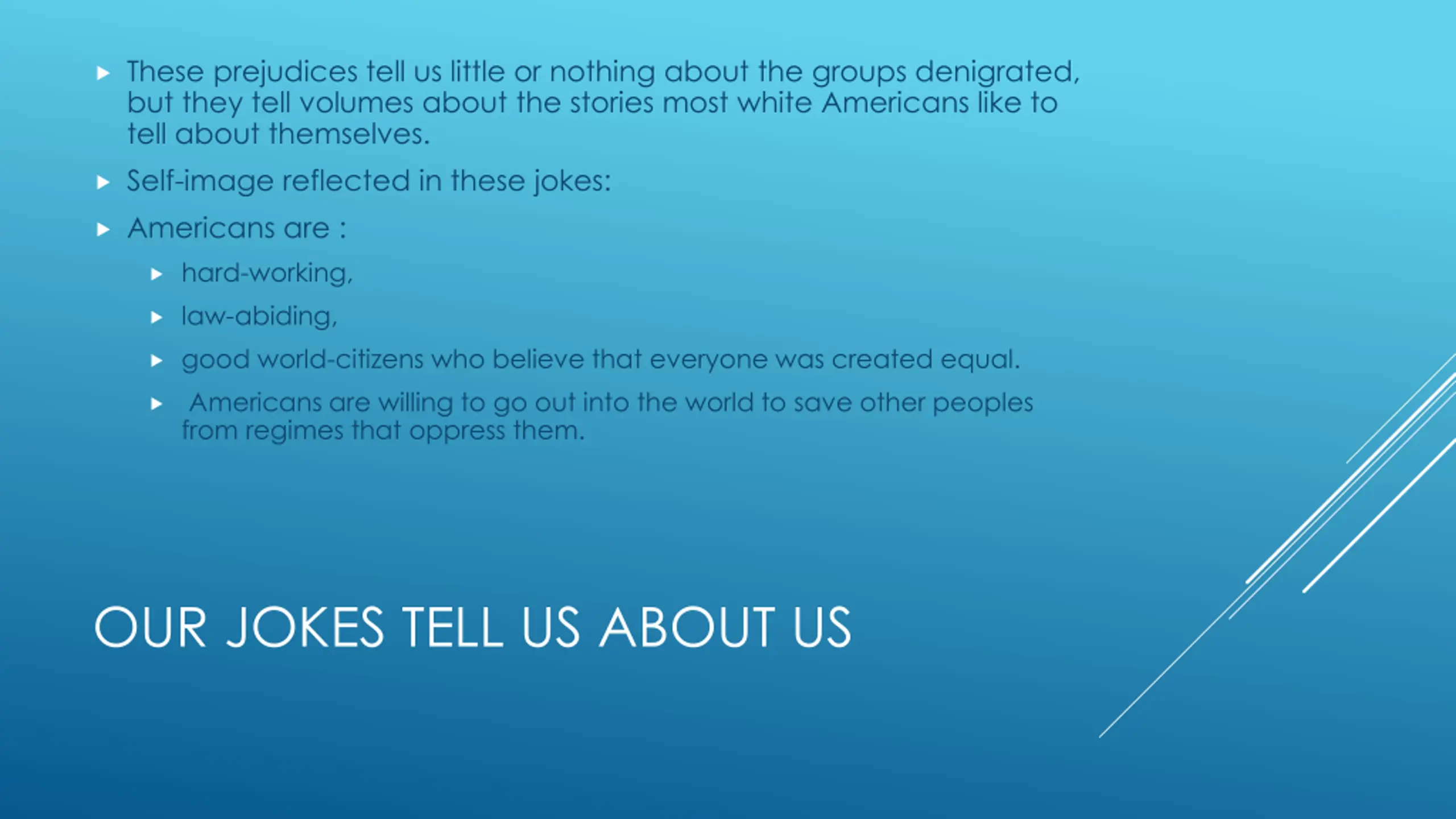 These prejudices tell us little or nothing about the groups denigrated, but they tell volumes about the stories most white Americans like to tell about themselves. Self-image reflected in these jokes: Americans are : hard-working, law-abiding, good world-citizens who believe that everyone was created equal. Americans are willing to go out into the world to save other peoples from regimes that oppress them. OUR JOKES TELL US ABOUT US