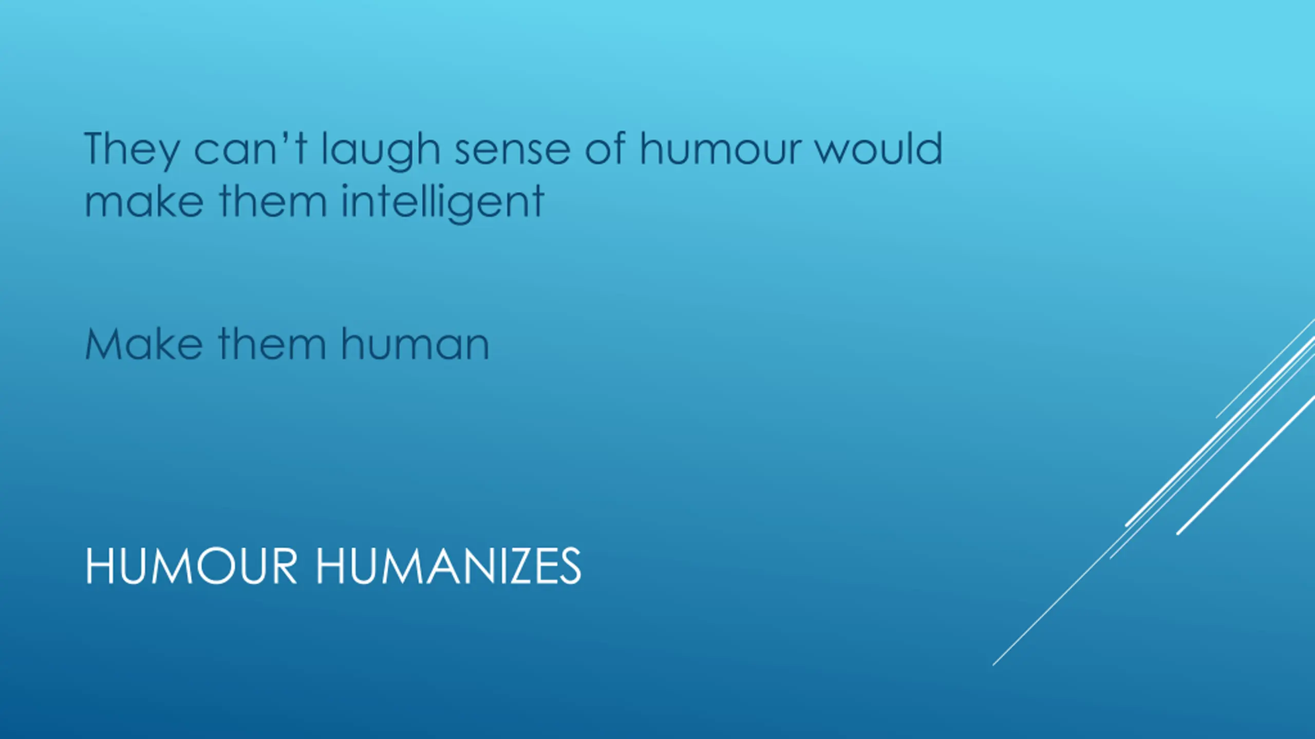 They cant laugh sense of humour would make them intelligent Make them human HUMOUR HUMANIZES