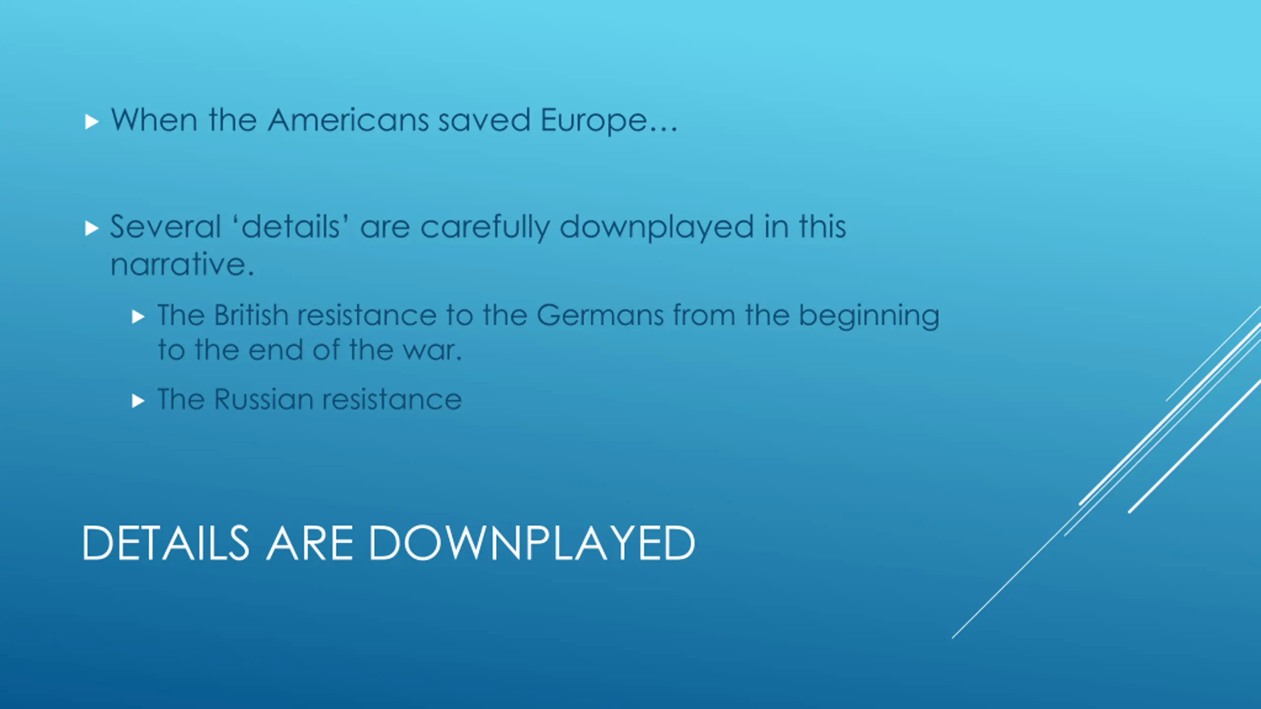 When the Americans saved Europe Several details are carefully downplayed in this narrative. The British resistance to the Germans from the beginning to the end of the war. The Russian resistance DETAILS ARE DOWNPLAYED