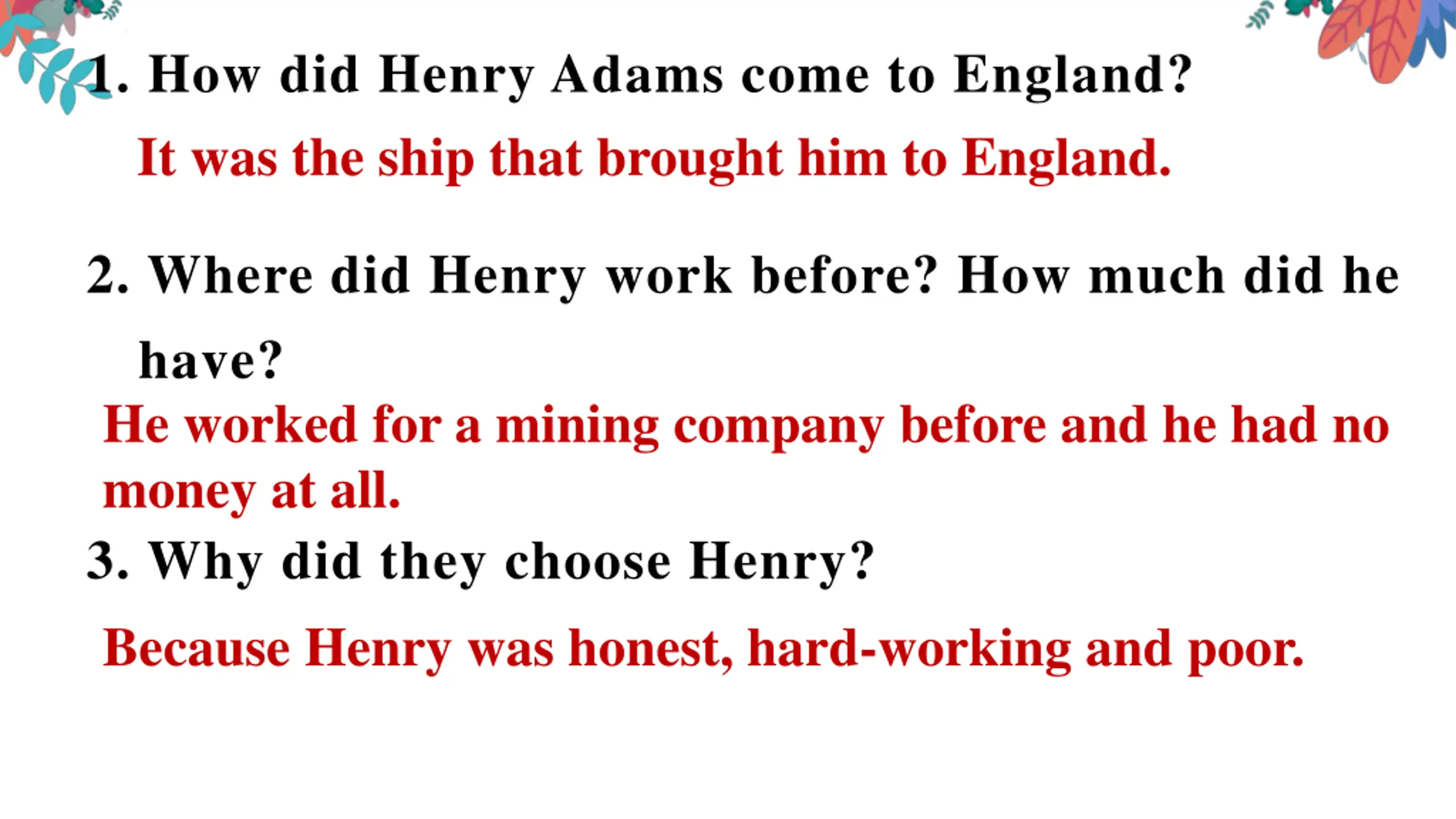 1. How did Henry Adams come to England? It was the ship that brought him to England. 2. Where did Henry work before? How much did he have? He worked for a mining company before and he had no money at all. 3. Why did they choose Henry? Because Henry was honest, hard-working and poor.