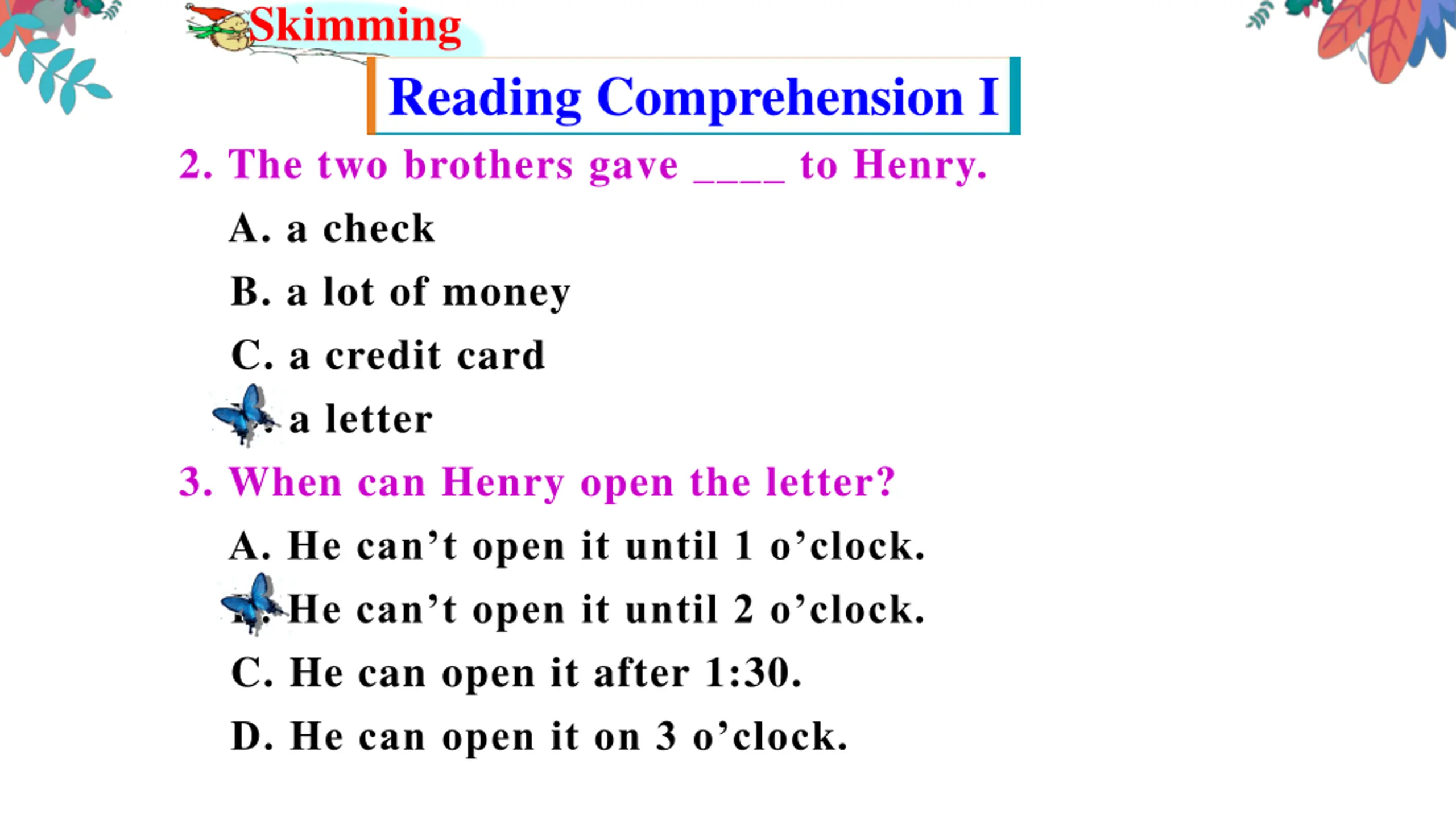 Skimming Reading Comprehension I 2. The two brothers gave ____ to Henry. A. a check B. a lot of money C. a credit card D. a letter 3. When can Henry open the letter? A. He can t open it until 1 o clock. B. He can t open it until 2 o clock. C. He can open it after 1:30. D. He can open it on 3 o clock.