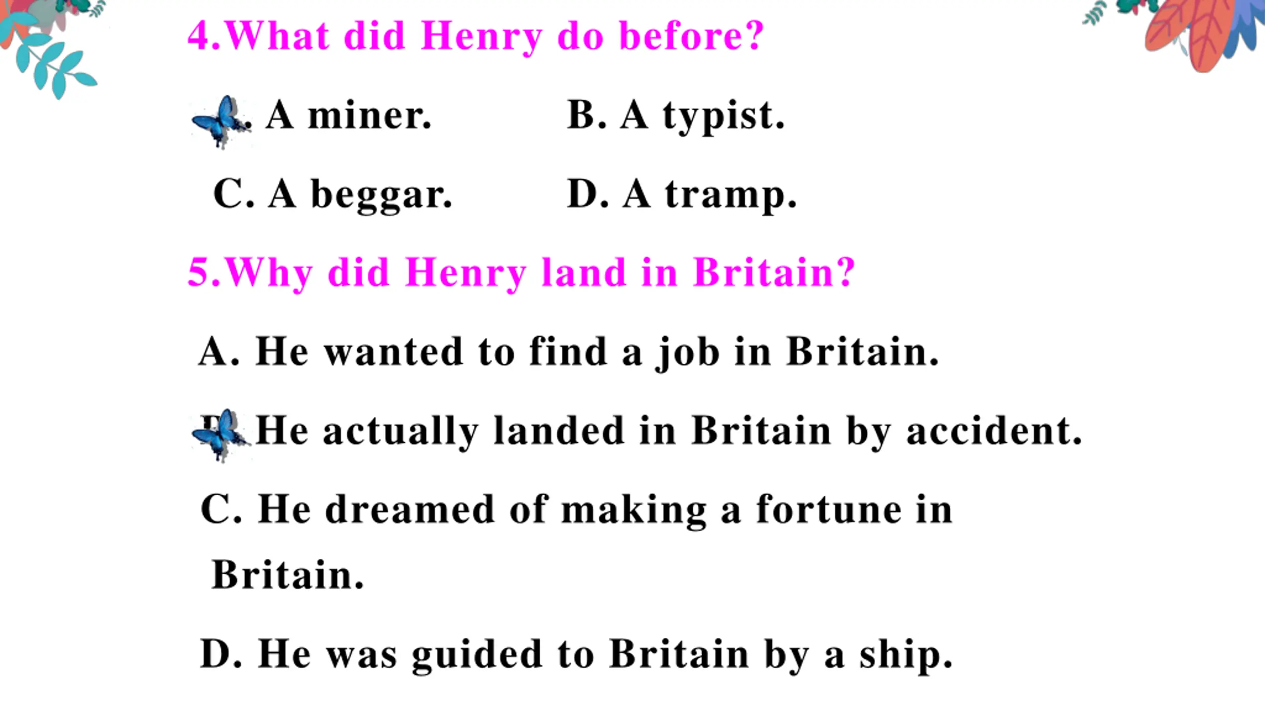 4.What did Henry do before? A. A miner. B. A typist. C. A beggar. D. A tramp. 5.Why did Henry land in Britain? A. He wanted to find a job in Britain. B. He actually landed in Britain by accident. C. He dreamed of making a fortune in Britain. D. He was guided to Britain by a ship.