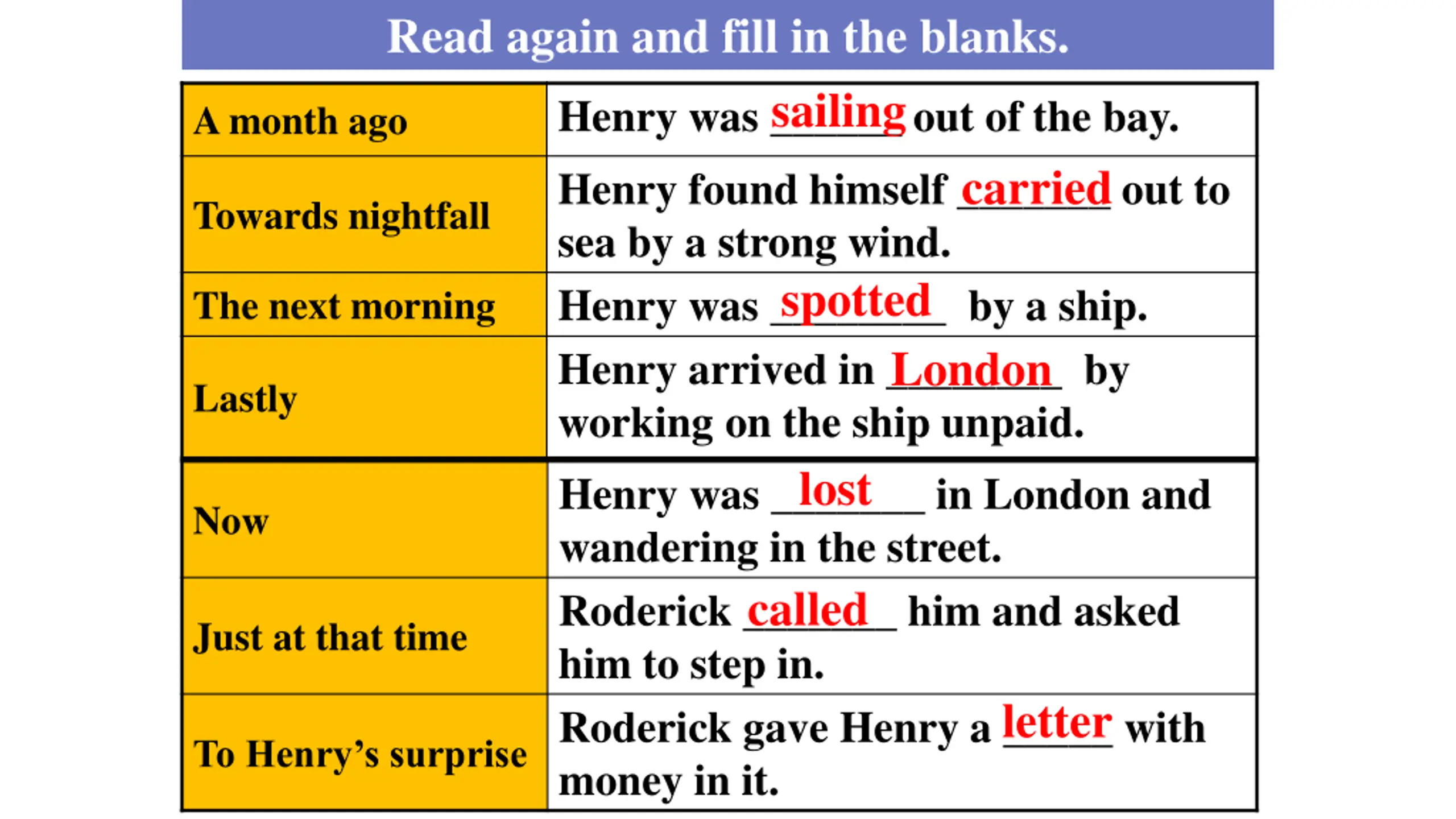 Read again and fill in the blanks. sailing Henry was ______ out of the bay. Henry found himself _______ out to sea by a strong wind. Henry was ________ by a ship. Henry arrived in ________ by working on the ship unpaid. Henry was _______ in London and wandering in the street. Roderick _______ him and asked him to step in. Roderick gave Henry a _____ with money in it. A month ago carried Towards nightfall spotted The next morning London Lastly lost Now called Just at that time letter To Henry s surprise