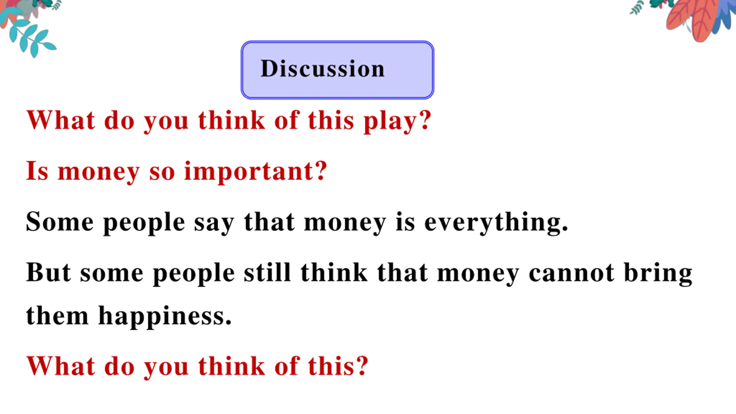 Discussion What do you think of this play? Is money so important? Some people say that money is everything. But some people still think that money cannot bring them happiness. What do you think of this?