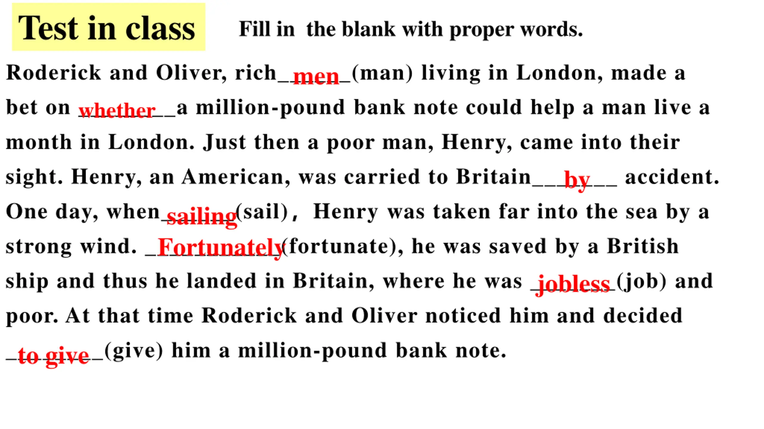 Test in class Fill in the blank with proper words. Roderick and Oliver, rich______(man) living in London, made a bet on ________a million-pound bank note could help a man live a month in London. Just then a poor man, Henry, came into their sight. Henry, an American, was carried to Britain_______ accident. One day, when______(sail) Henry was taken far into the sea by a strong wind. ___________(fortunate), he was saved by a British ship and thus he landed in Britain, where he was _______(job) and poor. At that time Roderick and Oliver noticed him and decided ________(give) him a million-pound bank note. to give men whether by sailing Fortunately jobless