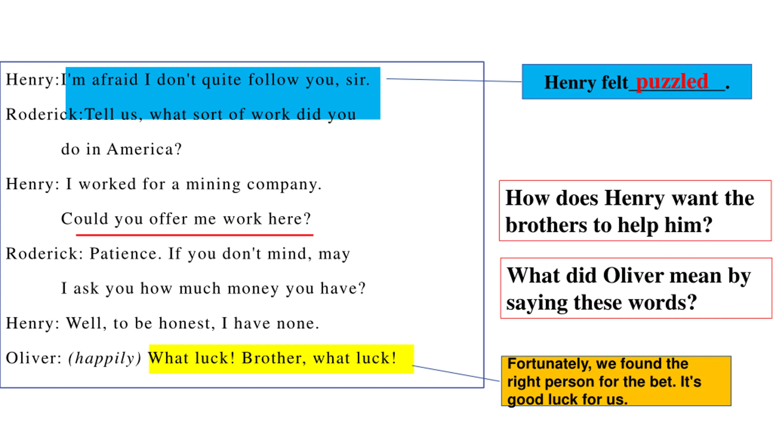 Henry felt__________. puzzled Henry:I'm afraid I don't quite follow you, sir. Roderick:Tell us, what sort of work did you do in America? Henry: I worked for a mining company. How does Henry want the brothers to help him? Could you offer me work here? Roderick: Patience. If you don't mind, may What did Oliver mean by saying these words? I ask you how much money you have? Henry: Well, to be honest, I have none. Oliver: (happily) What luck! Brother, what luck! Fortunately, we found the right person for the bet. It's good luck for us.