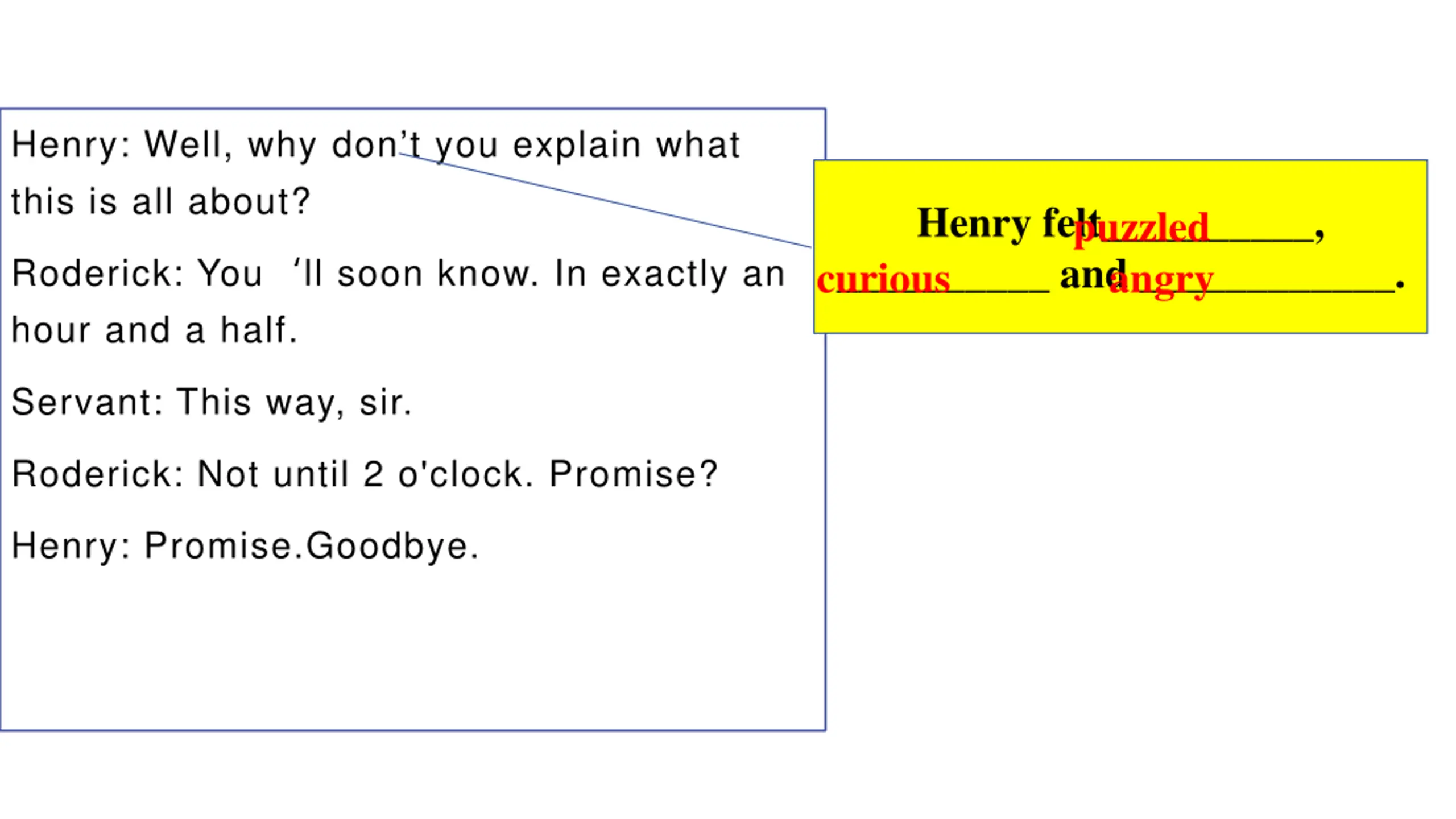 Henry: Well, why dont you explain what this is all about? Henry felt__________, __________ and ____________. curious angry puzzled Roderick: You ll soon know. In exactly an hour and a half. Servant: This way, sir. Roderick: Not until 2 o'clock. Promise? Henry: Promise.Goodbye.