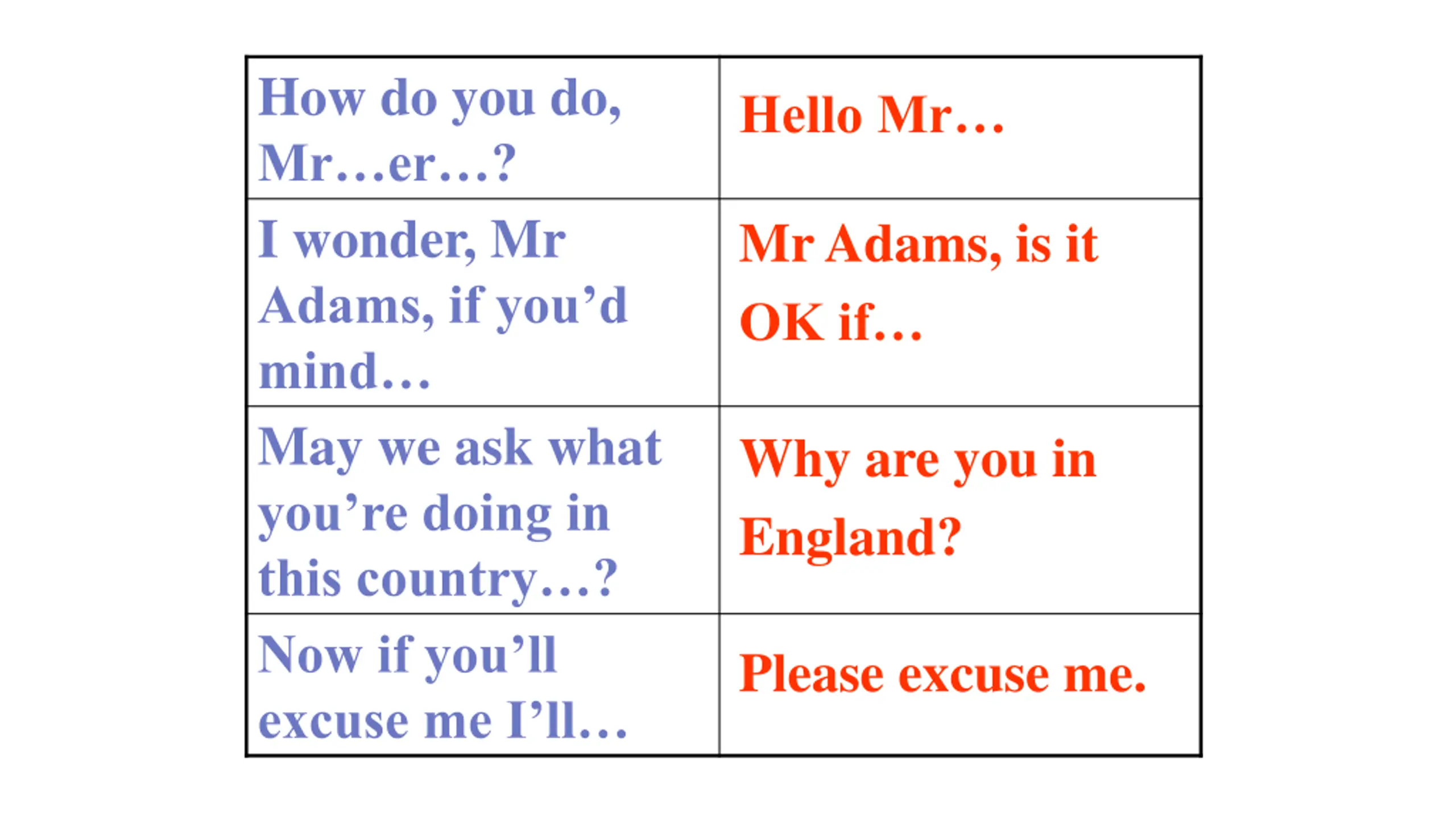 How do you do, Mr er ? I wonder, Mr Adams, if you d mind May we ask what you re doing in this country ? Now if you ll excuse me I ll Hello Mr Mr Adams, is it OK if Why are you in England? Please excuse me.