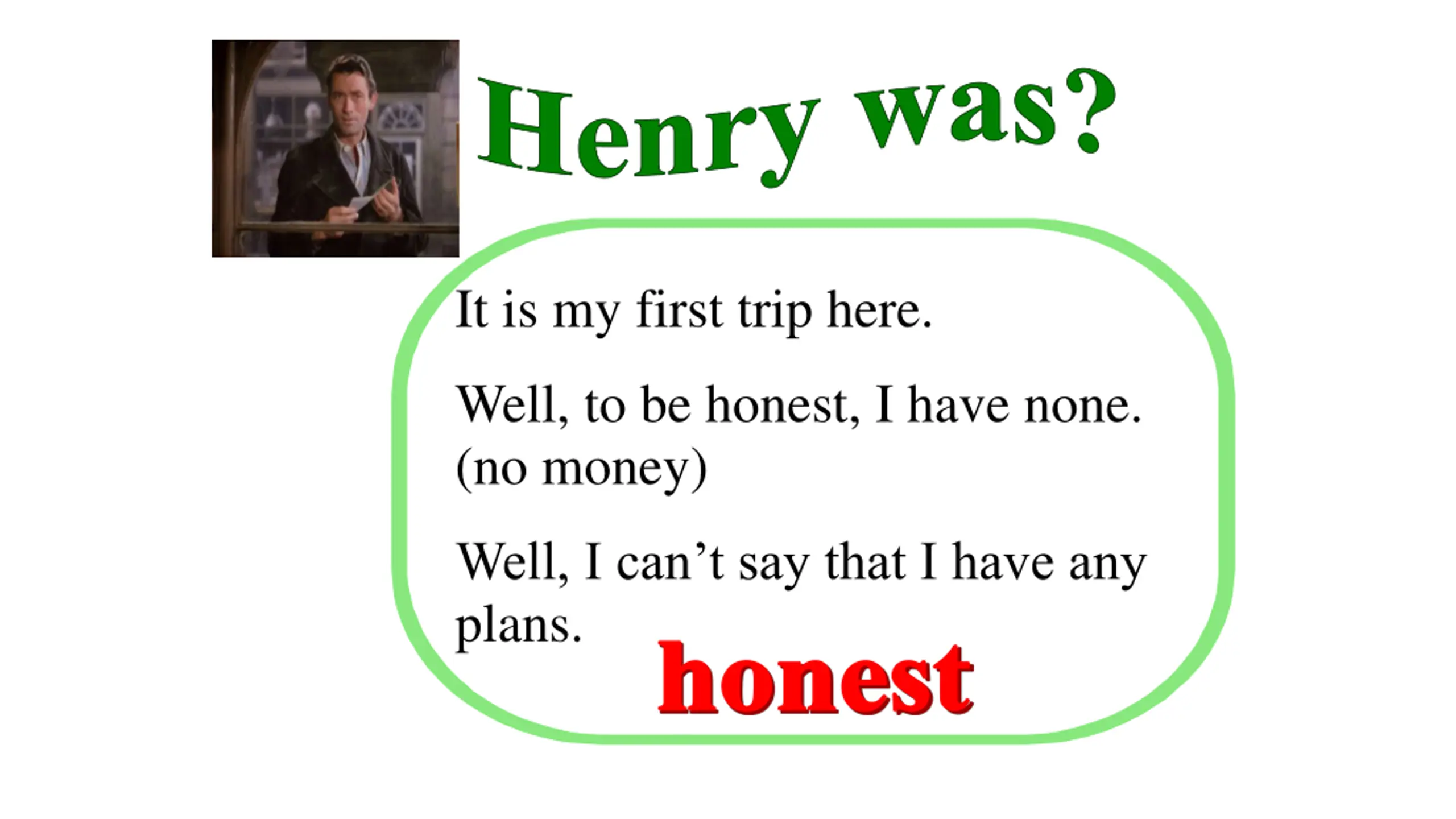 Henry was? It is my first trip here. Well, to be honest, I have none. (no money) Well, I can t say that I have any plans. honest