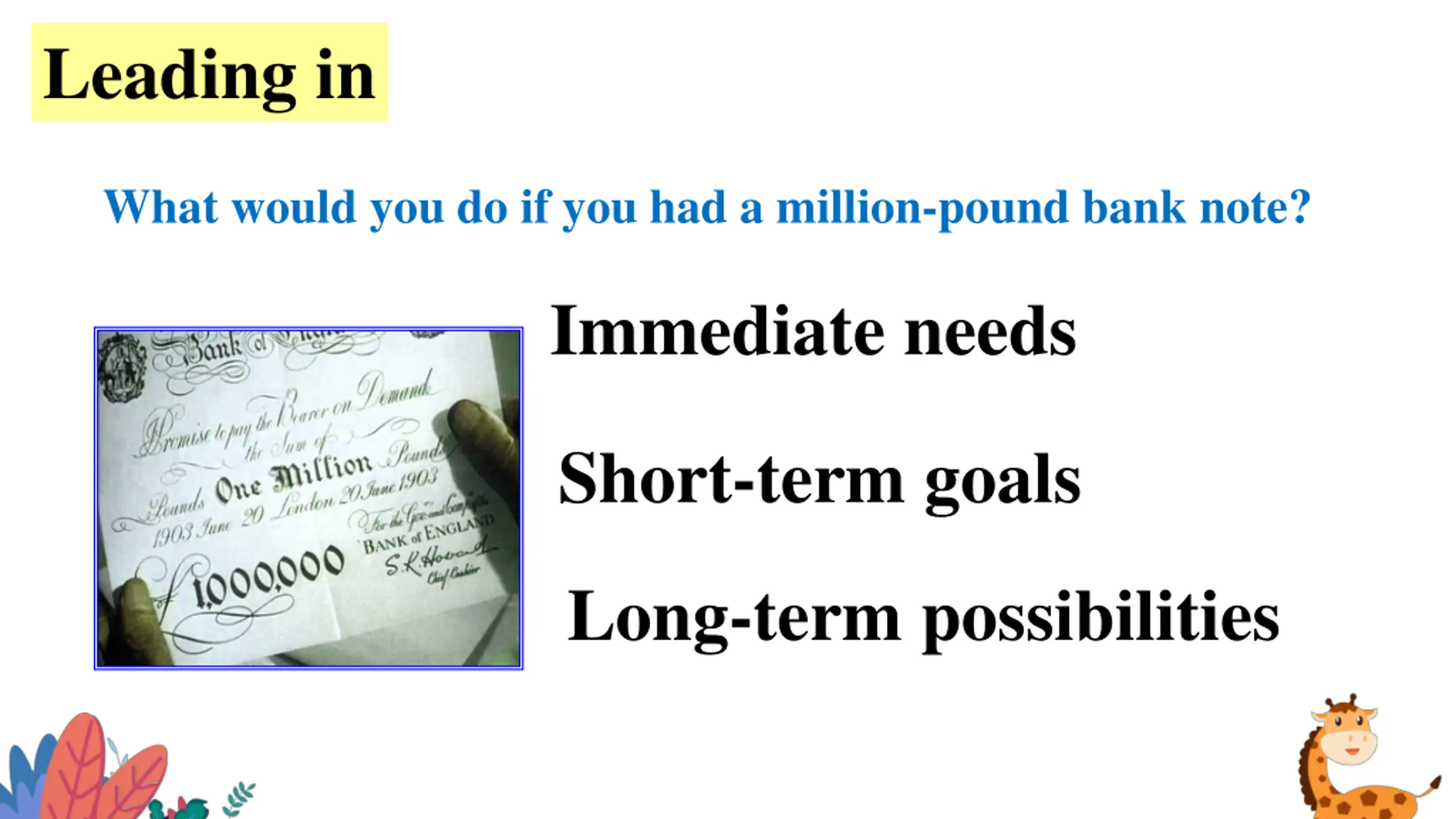Leading in What would you do if you had a million-pound bank note? Immediate needs Short-term goals Long-term possibilities