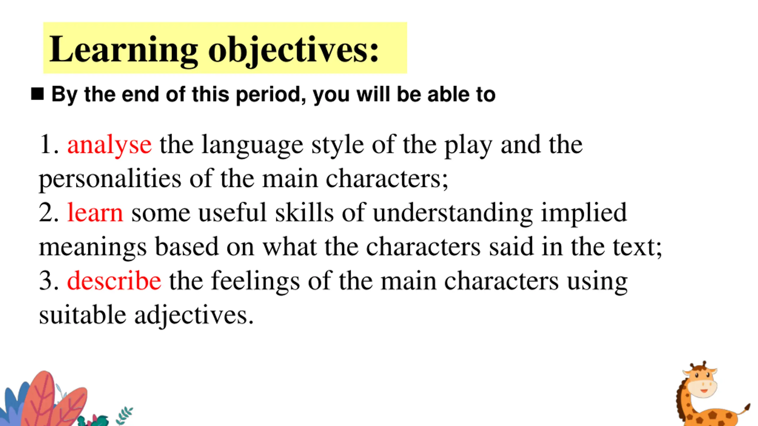 Learning objectives: By the end of this period, you will be able to 1. analyse the language style of the play and the personalities of the main characters; 2. learn some useful skills of understanding implied meanings based on what the characters said in the text; 3. describe the feelings of the main characters using suitable adjectives.