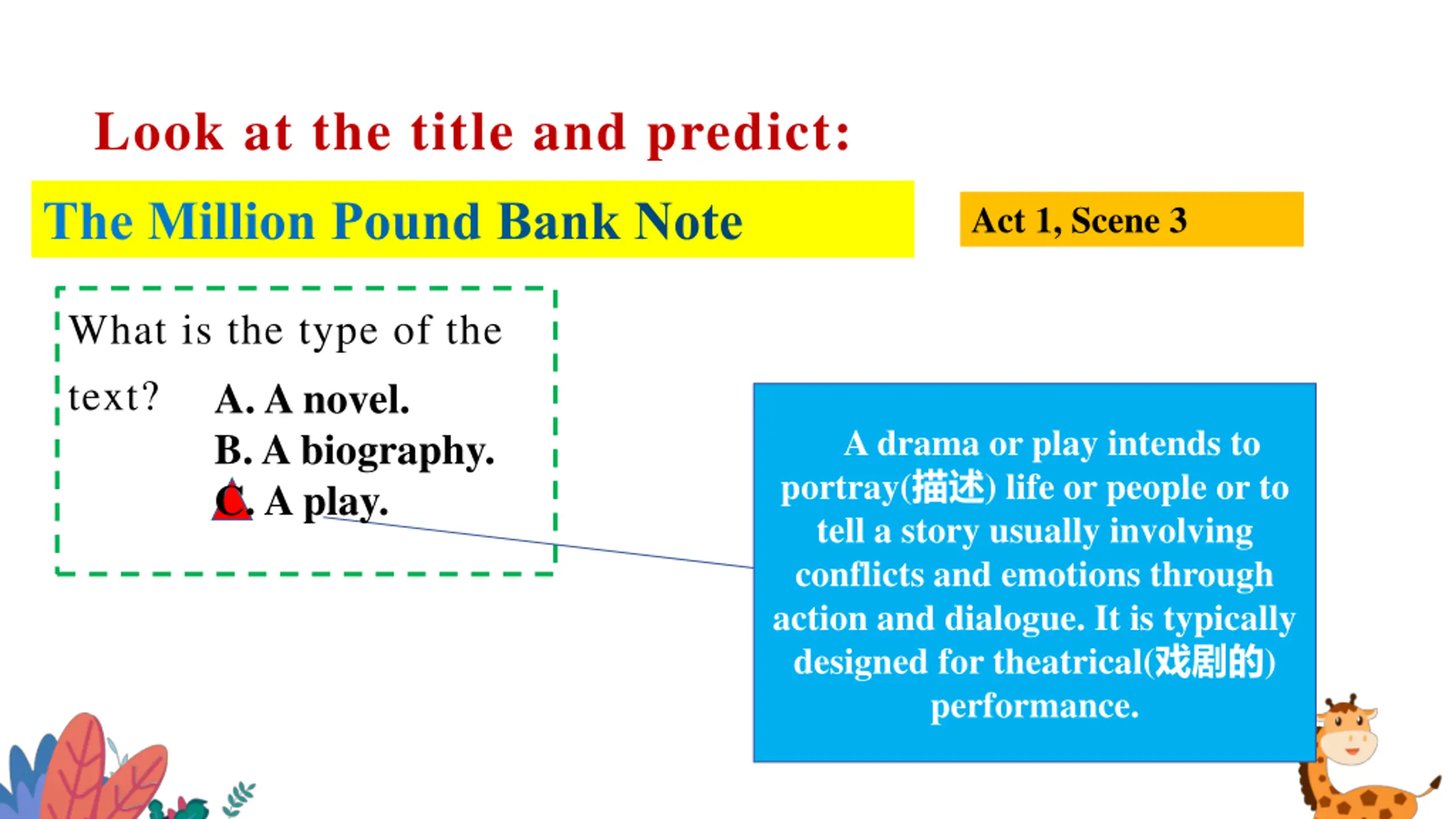 Look at the title and predict: The Million Pound Bank Note Act 1, Scene 3 What is the type of the text? A. A novel. B. A biography. C. A play. A drama or play intends to portray( ) life or people or to tell a story usually involving conflicts and emotions through action and dialogue. It is typically designed for theatrical( ) performance.