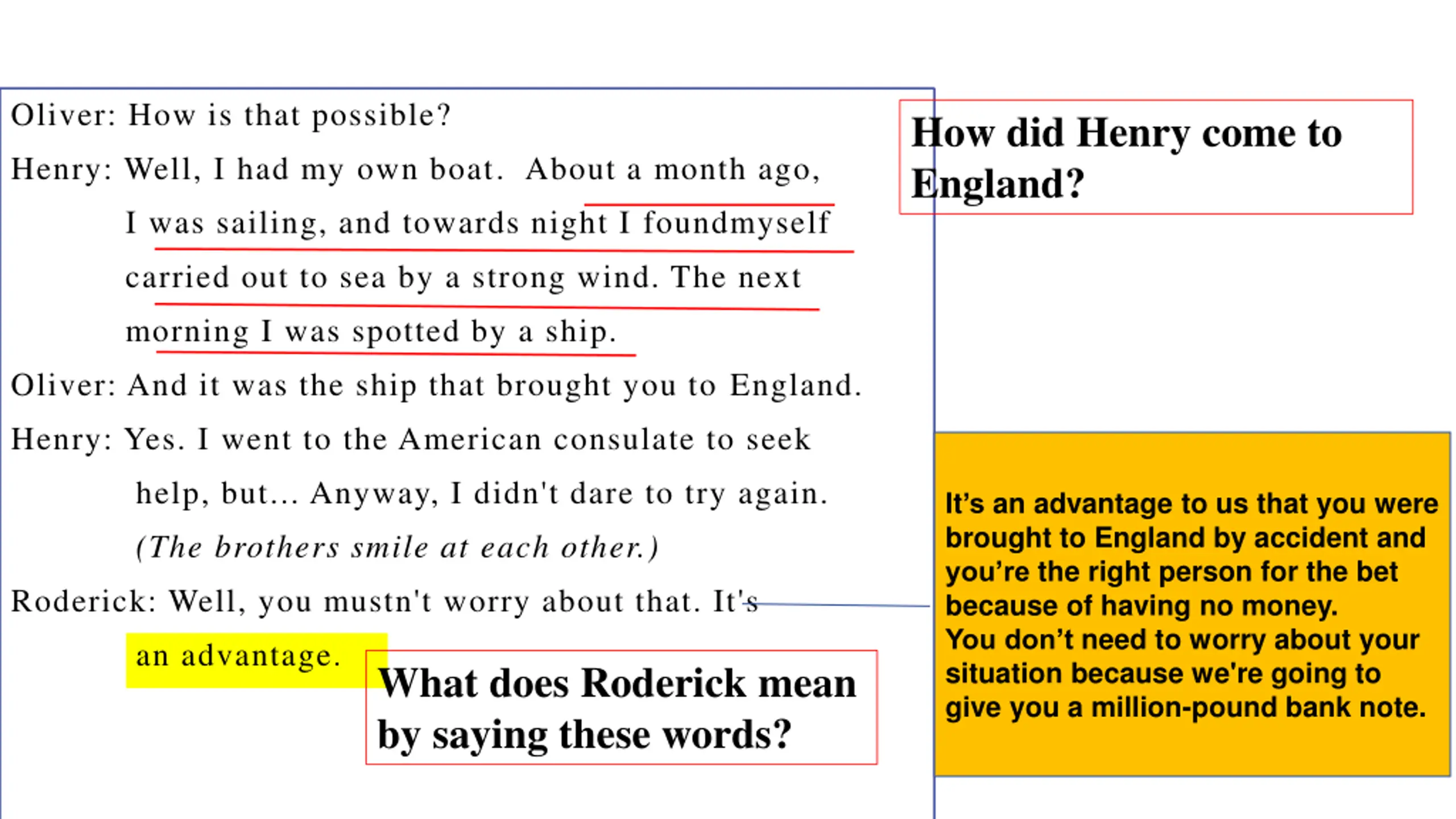 Oliver: How is that possible? How did Henry come to England? Henry: Well, I had my own boat. About a month ago, I was sailing, and towards night I foundmyself carried out to sea by a strong wind. The next morning I was spotted by a ship. Oliver: And it was the ship that brought you to England. Henry: Yes. I went to the American consulate to seek help, but... Anyway, I didn't dare to try again. It s an advantage to us that you were brought to England by accident and you re the right person for the bet because of having no money. You don t need to worry about your situation because we're going to give you a million-pound bank note. (The brothers smile at each other.) Roderick: Well, you mustn't worry about that. It's an advantage. What does Roderick mean by saying these words?