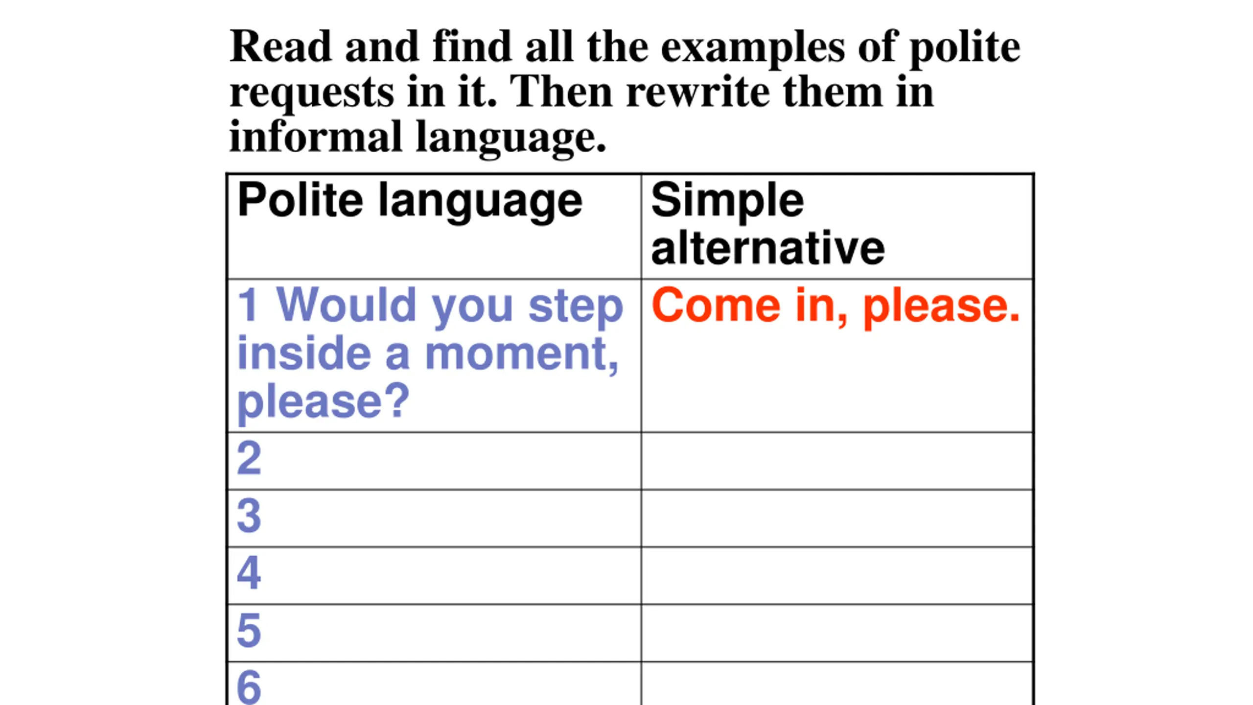 Read and find all the examples of polite requests in it. Then rewrite them in informal language. Polite language Simple alternative Come in, please. 1 Would you step inside a moment, please? 2 3 4 5 6