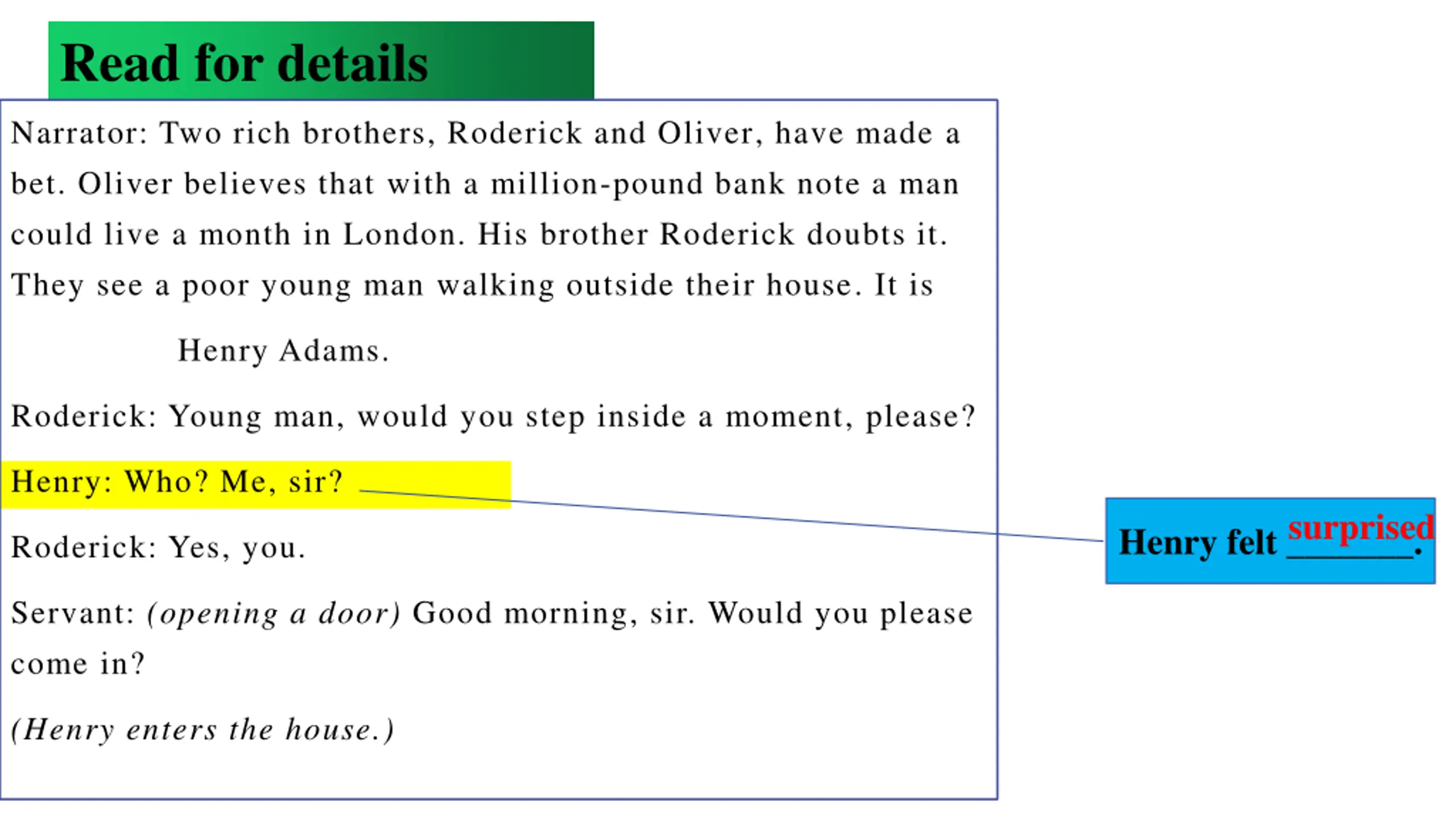 Read for details Narrator: Two rich brothers, Roderick and Oliver, have made a bet. Oliver believes that with a million-pound bank note a man could live a month in London. His brother Roderick doubts it. They see a poor young man walking outside their house. It is Henry Adams. Roderick: Young man, would you step inside a moment, please? Henry: Who? Me, sir? surprised Henry felt _______. Roderick: Yes, you. Servant: (opening a door) Good morning, sir. Would you please come in? (Henry enters the house.)