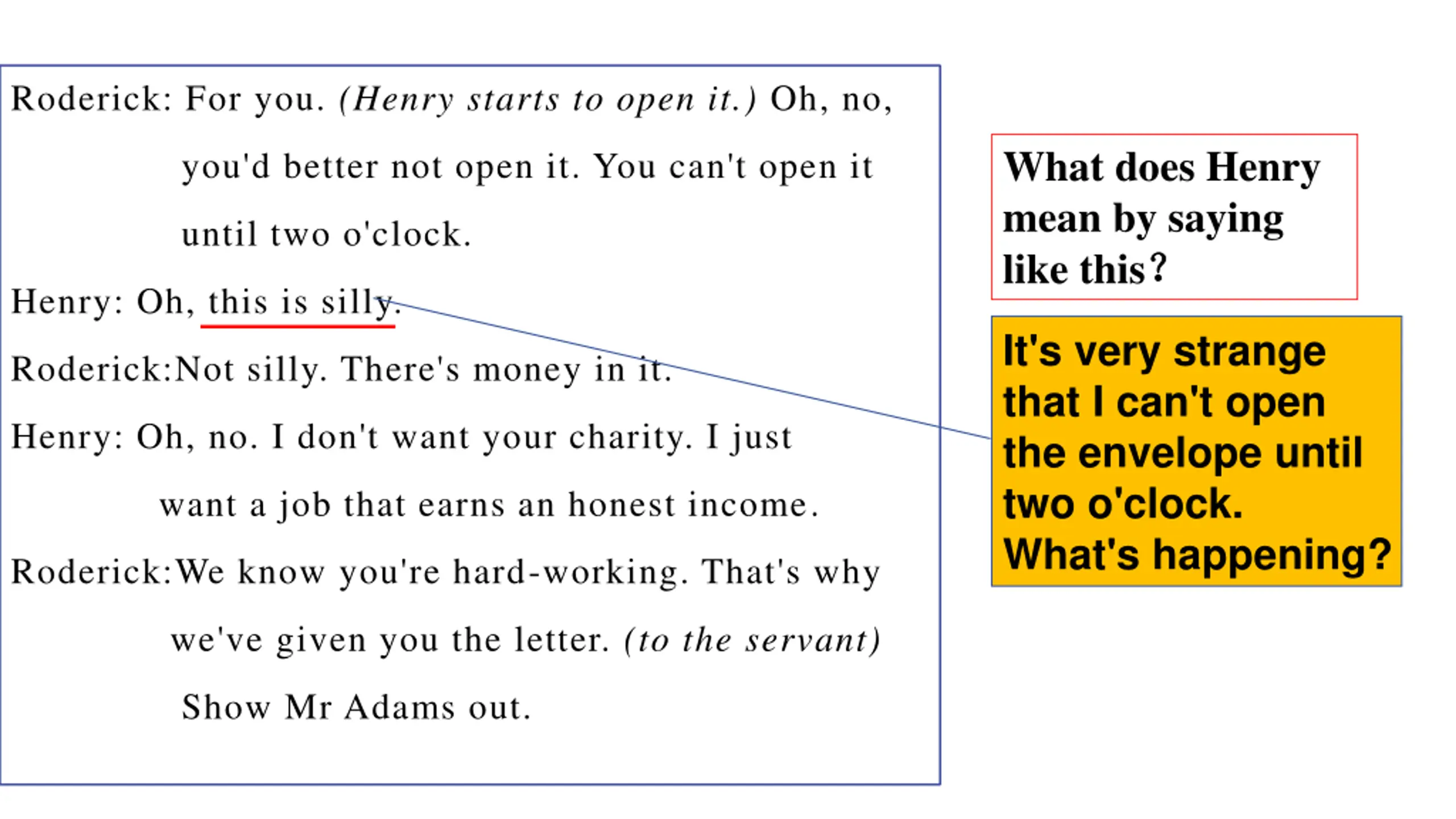 Roderick: For you. (Henry starts to open it.) Oh, no, What does Henry mean by saying like this you'd better not open it. You can't open it until two o'clock. Henry: Oh, this is silly. It's very strange that I can't open the envelope until two o'clock. What's happening? Roderick:Not silly. There's money in it. Henry: Oh, no. I don't want your charity. I just want a job that earns an honest income. Roderick:We know you're hard-working. That's why we've given you the letter. (to the servant) Show Mr Adams out.