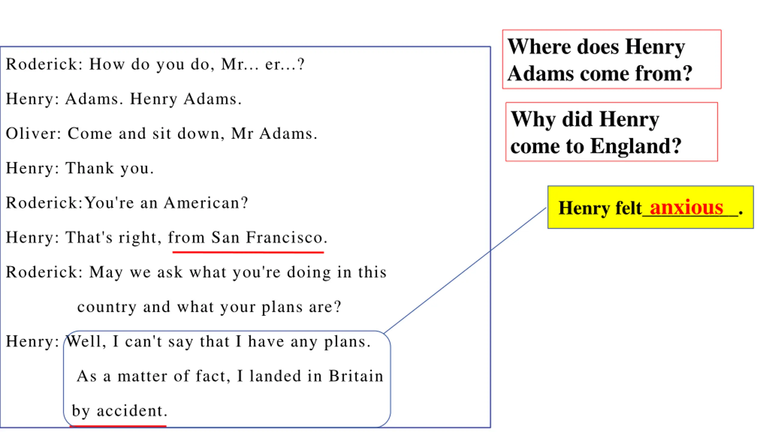 Where does Henry Adams come from? Roderick: How do you do, Mr... er...? Henry: Adams. Henry Adams. Why did Henry come to England? Oliver: Come and sit down, Mr Adams. Henry: Thank you. Roderick:You're an American? Henry felt__________. anxious Henry: That's right, from San Francisco. Roderick: May we ask what you're doing in this country and what your plans are? Henry: Well, I can't say that I have any plans. As a matter of fact, I landed in Britain by accident.