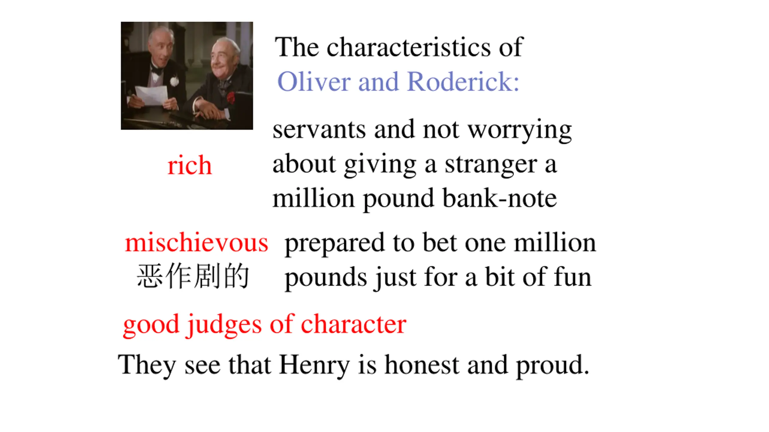 The characteristics of Oliver and Roderick: servants and not worrying about giving a stranger a million pound bank-note prepared to bet one million pounds just for a bit of fun rich mischievous good judges of character They see that Henry is honest and proud.