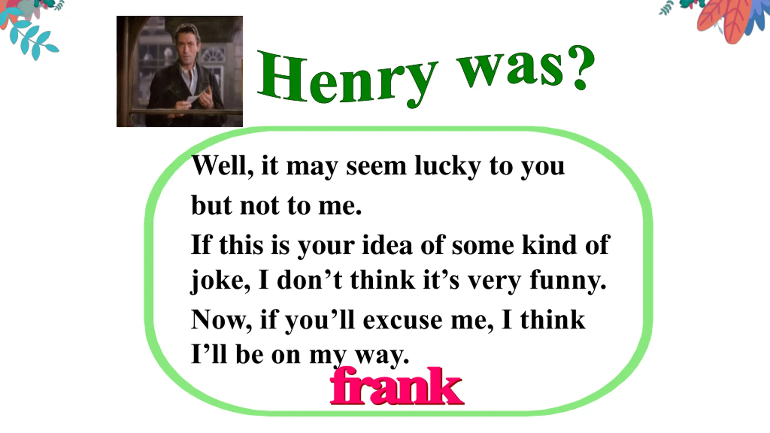 Henry was? Well, it may seem lucky to you but not to me. If this is your idea of some kind of joke, I don t think it s very funny. Now, if you ll excuse me, I think I ll be on my way. frank