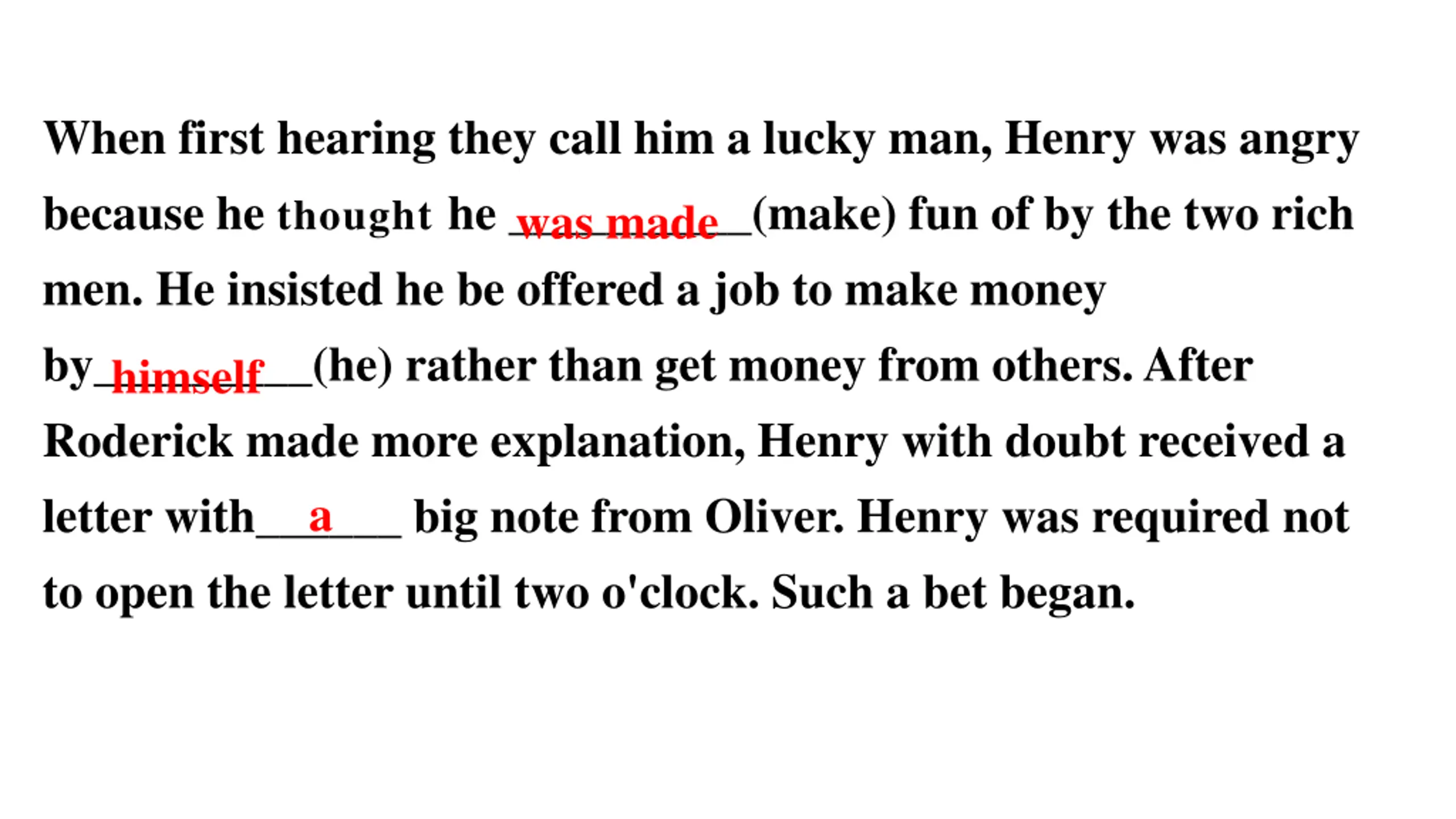 When first hearing they call him a lucky man, Henry was angry because he thought he __________(make) fun of by the two rich men. He insisted he be offered a job to make money by_________(he) rather than get money from others. After Roderick made more explanation, Henry with doubt received a letter with______ big note from Oliver. Henry was required not to open the letter until two o'clock. Such a bet began. was made himself a