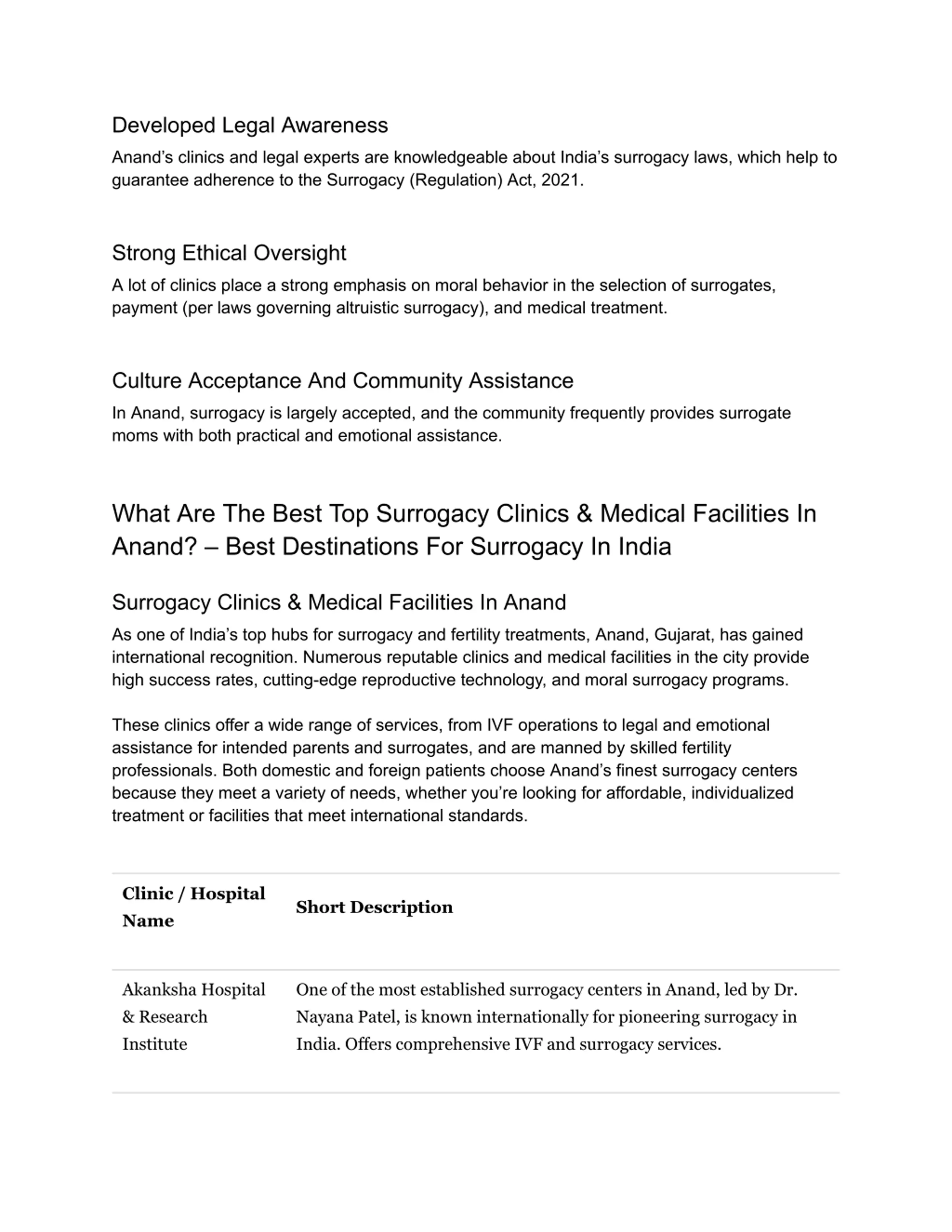 Developed Legal Awareness Anand s clinics and legal experts are knowledgeable about India s surrogacy laws, which help to guarantee adherence to the Surrogacy (Regulation) Act, 2021. Strong Ethical Oversight A lot of clinics place a strong emphasis on moral behavior in the selection of surrogates, payment (per laws governing altruistic surrogacy), and medical treatment. Culture Acceptance And Community Assistance In Anand, surrogacy is largely accepted, and the community frequently provides surrogate moms with both practical and emotional assistance. What Are The Best Top Surrogacy Clinics & Medical Facilities In Anand? Best Destinations For Surrogacy In India Surrogacy Clinics & Medical Facilities In Anand As one of India s top hubs for surrogacy and fertility treatments, Anand, Gujarat, has gained international recognition. Numerous reputable clinics and medical facilities in the city provide high success rates, cutting-edge reproductive technology, and moral surrogacy programs. These clinics offer a wide range of services, from IVF operations to legal and emotional assistance for intended parents and surrogates, and are manned by skilled fertility professionals. Both domestic and foreign patients choose Anand s finest surrogacy centers because they meet a variety of needs, whether you re looking for affordable, individualized treatment or facilities that meet international standards. Clinic / Hospital Name Short Description Akanksha Hospital & Research Institute One of the most established surrogacy centers in Anand, led by Dr. Nayana Patel, is known internationally for pioneering surrogacy in India. Offers comprehensive IVF and surrogacy services.