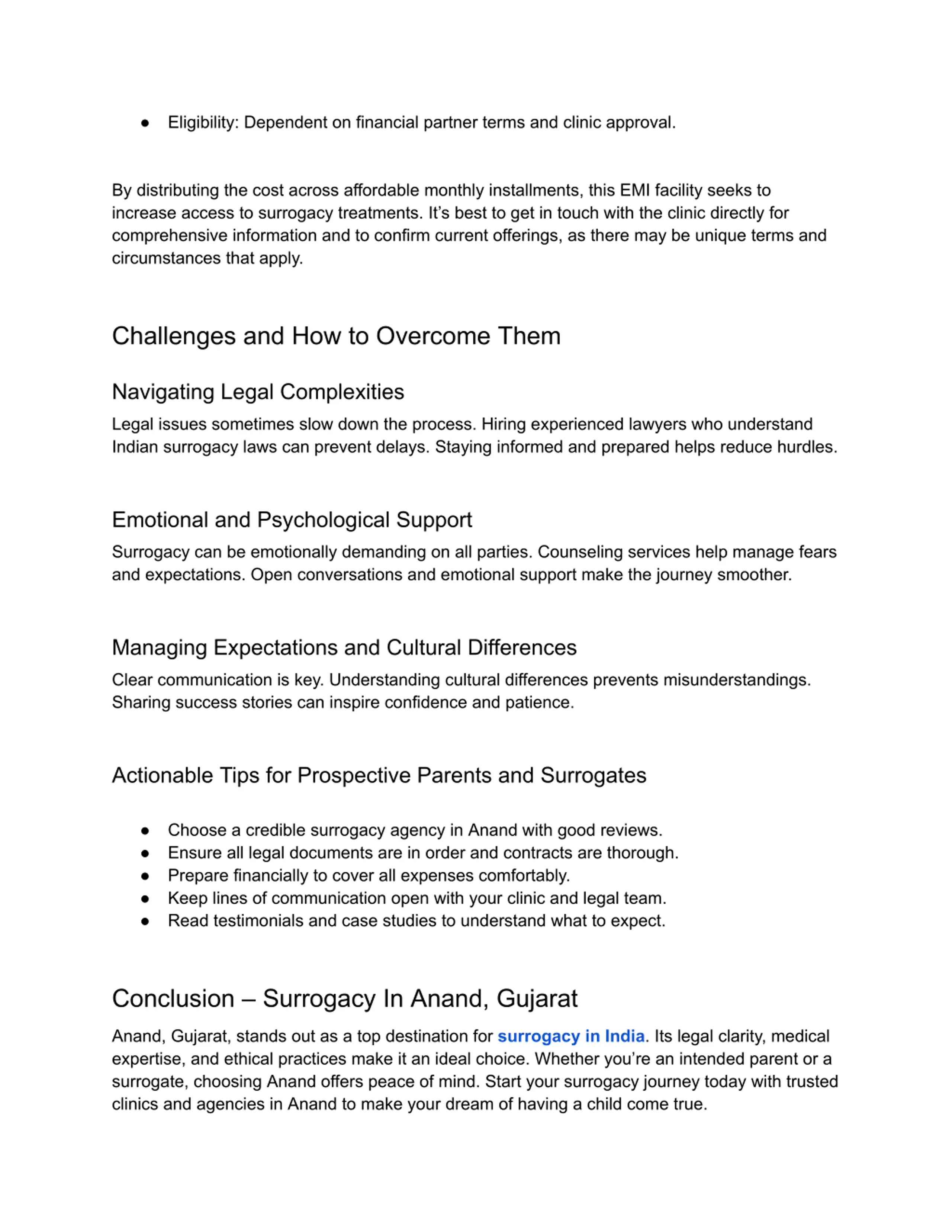 Eligibility: Dependent on financial partner terms and clinic approval. By distributing the cost across affordable monthly installments, this EMI facility seeks to increase access to surrogacy treatments. It s best to get in touch with the clinic directly for comprehensive information and to confirm current offerings, as there may be unique terms and circumstances that apply. Challenges and How to Overcome Them Navigating Legal Complexities Legal issues sometimes slow down the process. Hiring experienced lawyers who understand Indian surrogacy laws can prevent delays. Staying informed and prepared helps reduce hurdles. Emotional and Psychological Support Surrogacy can be emotionally demanding on all parties. Counseling services help manage fears and expectations. Open conversations and emotional support make the journey smoother. Managing Expectations and Cultural Differences Clear communication is key. Understanding cultural differences prevents misunderstandings. Sharing success stories can inspire confidence and patience. Actionable Tips for Prospective Parents and Surrogates Choose a credible surrogacy agency in Anand with good reviews. Ensure all legal documents are in order and contracts are thorough. Prepare financially to cover all expenses comfortably. Keep lines of communication open with your clinic and legal team. Read testimonials and case studies to understand what to expect. Conclusion Surrogacy In Anand, Gujarat Anand, Gujarat, stands out as a top destination for surrogacy in India. Its legal clarity, medical expertise, and ethical practices make it an ideal choice. Whether you re an intended parent or a surrogate, choosing Anand offers peace of mind. Start your surrogacy journey today with trusted clinics and agencies in Anand to make your dream of having a child come true.