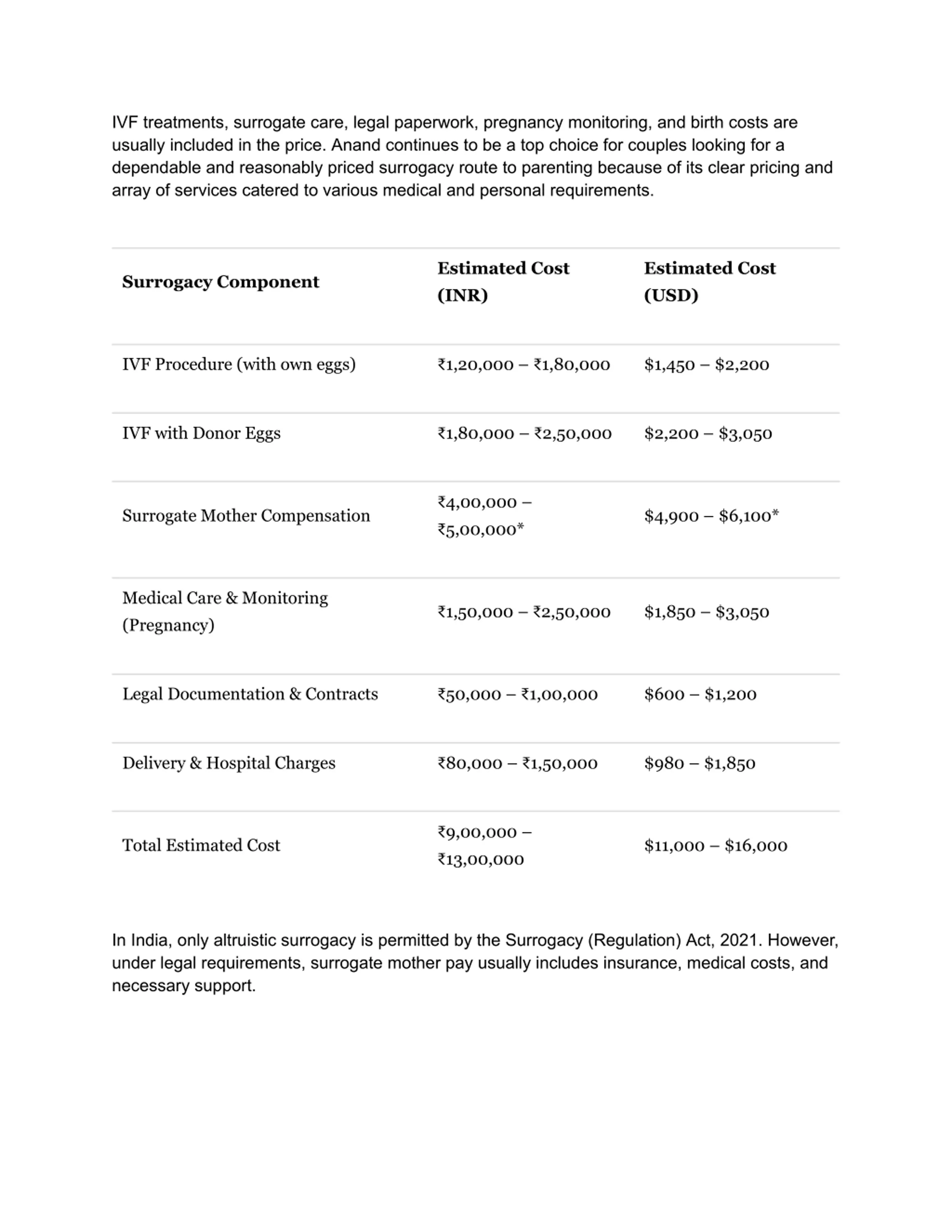 IVF treatments, surrogate care, legal paperwork, pregnancy monitoring, and birth costs are usually included in the price. Anand continues to be a top choice for couples looking for a dependable and reasonably priced surrogacy route to parenting because of its clear pricing and array of services catered to various medical and personal requirements. Estimated Cost (INR) Estimated Cost (USD) Surrogacy Component IVF Procedure (with own eggs) 1,20,000 1,80,000 $1,450 $2,200 IVF with Donor Eggs 1,80,000 2,50,000 $2,200 $3,050 4,00,000 5,00,000* Surrogate Mother Compensation $4,900 $6,100* Medical Care & Monitoring (Pregnancy) 1,50,000 2,50,000 $1,850 $3,050 Legal Documentation & Contracts 50,000 1,00,000 $600 $1,200 Delivery & Hospital Charges 80,000 1,50,000 $980 $1,850 9,00,000 13,00,000 Total Estimated Cost $11,000 $16,000 In India, only altruistic surrogacy is permitted by the Surrogacy (Regulation) Act, 2021. However, under legal requirements, surrogate mother pay usually includes insurance, medical costs, and necessary support.