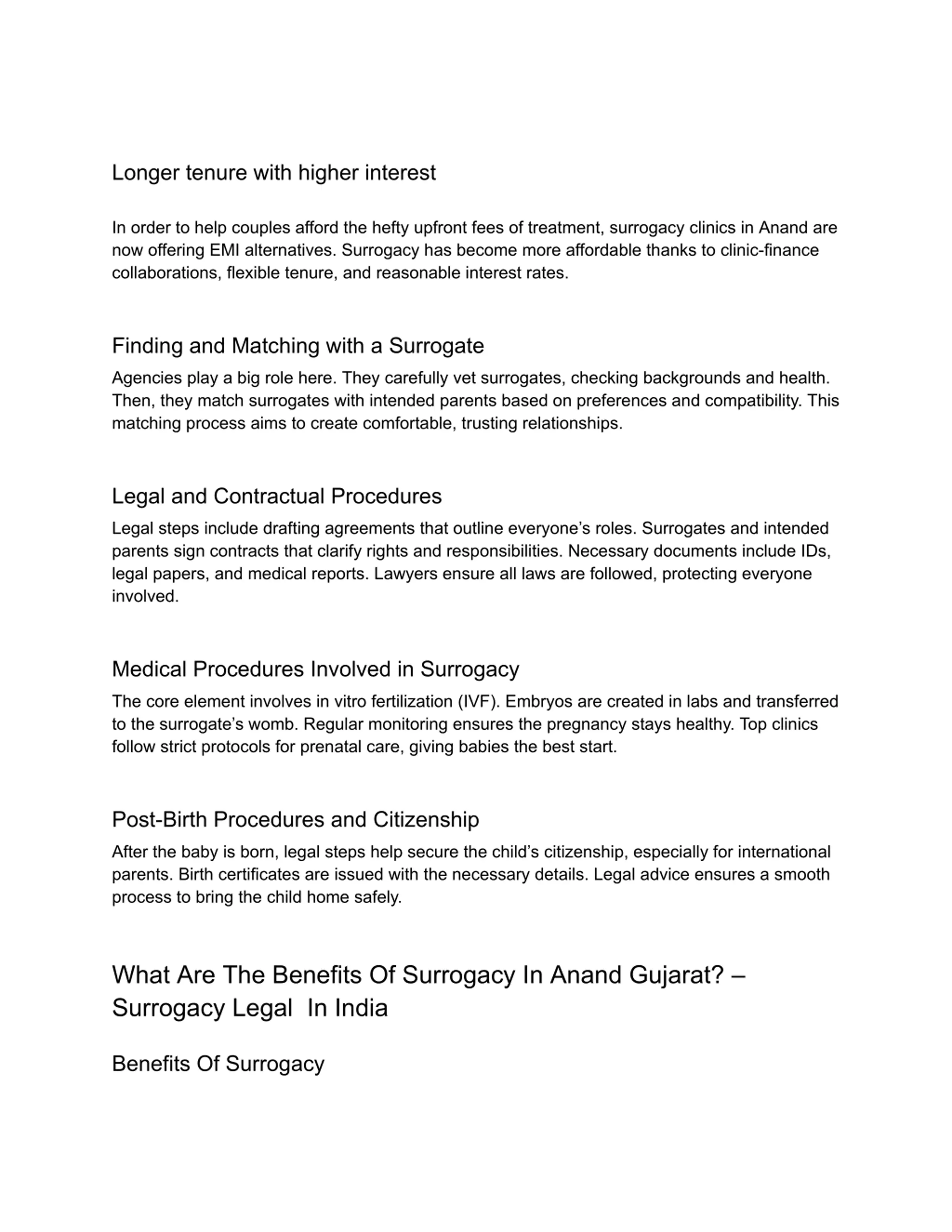 Longer tenure with higher interest In order to help couples afford the hefty upfront fees of treatment, surrogacy clinics in Anand are now offering EMI alternatives. Surrogacy has become more affordable thanks to clinic-finance collaborations, flexible tenure, and reasonable interest rates. Finding and Matching with a Surrogate Agencies play a big role here. They carefully vet surrogates, checking backgrounds and health. Then, they match surrogates with intended parents based on preferences and compatibility. This matching process aims to create comfortable, trusting relationships. Legal and Contractual Procedures Legal steps include drafting agreements that outline everyone s roles. Surrogates and intended parents sign contracts that clarify rights and responsibilities. Necessary documents include IDs, legal papers, and medical reports. Lawyers ensure all laws are followed, protecting everyone involved. Medical Procedures Involved in Surrogacy The core element involves in vitro fertilization (IVF). Embryos are created in labs and transferred to the surrogate s womb. Regular monitoring ensures the pregnancy stays healthy. Top clinics follow strict protocols for prenatal care, giving babies the best start. Post-Birth Procedures and Citizenship After the baby is born, legal steps help secure the child s citizenship, especially for international parents. Birth certificates are issued with the necessary details. Legal advice ensures a smooth process to bring the child home safely. What Are The Benefits Of Surrogacy In Anand Gujarat? Surrogacy Legal In India Benefits Of Surrogacy