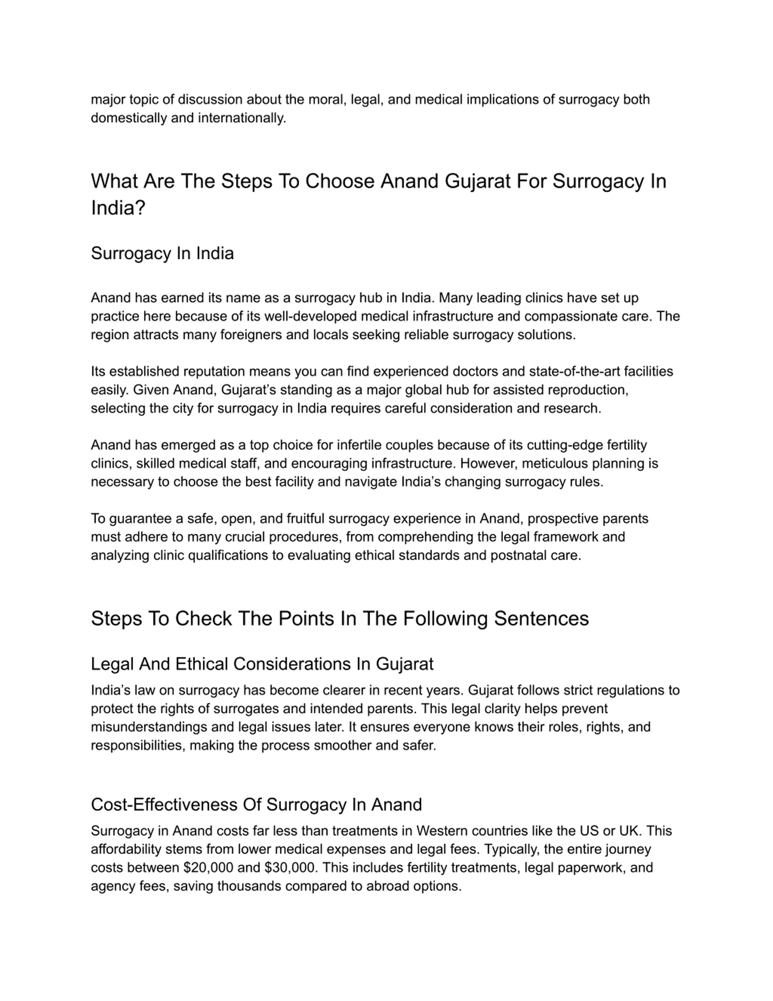 major topic of discussion about the moral, legal, and medical implications of surrogacy both domestically and internationally. What Are The Steps To Choose Anand Gujarat For Surrogacy In India? Surrogacy In India Anand has earned its name as a surrogacy hub in India. Many leading clinics have set up practice here because of its well-developed medical infrastructure and compassionate care. The region attracts many foreigners and locals seeking reliable surrogacy solutions. Its established reputation means you can find experienced doctors and state-of-the-art facilities easily. Given Anand, Gujarat s standing as a major global hub for assisted reproduction, selecting the city for surrogacy in India requires careful consideration and research. Anand has emerged as a top choice for infertile couples because of its cutting-edge fertility clinics, skilled medical staff, and encouraging infrastructure. However, meticulous planning is necessary to choose the best facility and navigate India s changing surrogacy rules. To guarantee a safe, open, and fruitful surrogacy experience in Anand, prospective parents must adhere to many crucial procedures, from comprehending the legal framework and analyzing clinic qualifications to evaluating ethical standards and postnatal care. Steps To Check The Points In The Following Sentences Legal And Ethical Considerations In Gujarat India s law on surrogacy has become clearer in recent years. Gujarat follows strict regulations to protect the rights of surrogates and intended parents. This legal clarity helps prevent misunderstandings and legal issues later. It ensures everyone knows their roles, rights, and responsibilities, making the process smoother and safer. Cost-Effectiveness Of Surrogacy In Anand Surrogacy in Anand costs far less than treatments in Western countries like the US or UK. This affordability stems from lower medical expenses and legal fees. Typically, the entire journey costs between $20,000 and $30,000. This includes fertility treatments, legal paperwork, and agency fees, saving thousands compared to abroad options.