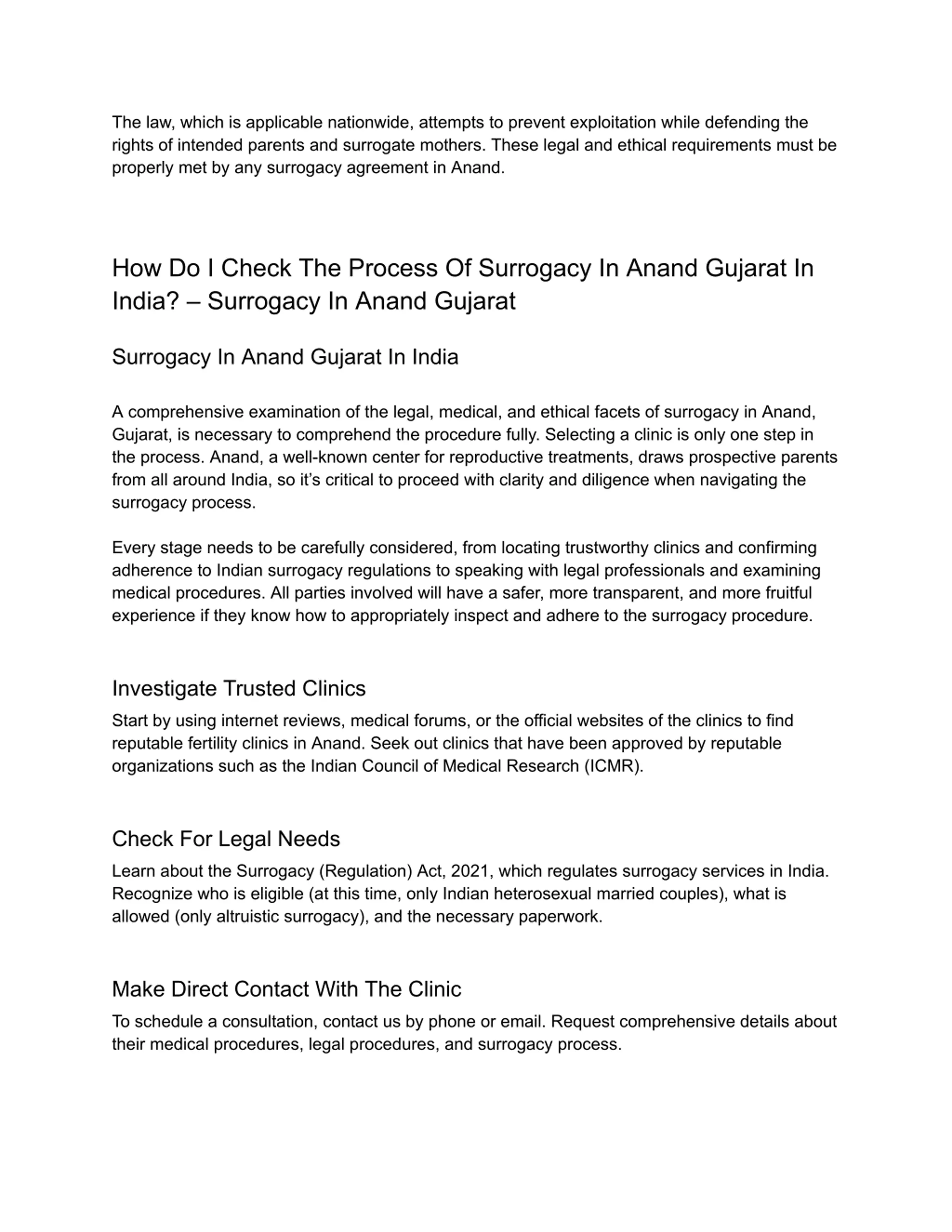 The law, which is applicable nationwide, attempts to prevent exploitation while defending the rights of intended parents and surrogate mothers. These legal and ethical requirements must be properly met by any surrogacy agreement in Anand. How Do I Check The Process Of Surrogacy In Anand Gujarat In India? Surrogacy In Anand Gujarat Surrogacy In Anand Gujarat In India A comprehensive examination of the legal, medical, and ethical facets of surrogacy in Anand, Gujarat, is necessary to comprehend the procedure fully. Selecting a clinic is only one step in the process. Anand, a well-known center for reproductive treatments, draws prospective parents from all around India, so it s critical to proceed with clarity and diligence when navigating the surrogacy process. Every stage needs to be carefully considered, from locating trustworthy clinics and confirming adherence to Indian surrogacy regulations to speaking with legal professionals and examining medical procedures. All parties involved will have a safer, more transparent, and more fruitful experience if they know how to appropriately inspect and adhere to the surrogacy procedure. Investigate Trusted Clinics Start by using internet reviews, medical forums, or the official websites of the clinics to find reputable fertility clinics in Anand. Seek out clinics that have been approved by reputable organizations such as the Indian Council of Medical Research (ICMR). Check For Legal Needs Learn about the Surrogacy (Regulation) Act, 2021, which regulates surrogacy services in India. Recognize who is eligible (at this time, only Indian heterosexual married couples), what is allowed (only altruistic surrogacy), and the necessary paperwork. Make Direct Contact With The Clinic To schedule a consultation, contact us by phone or email. Request comprehensive details about their medical procedures, legal procedures, and surrogacy process.