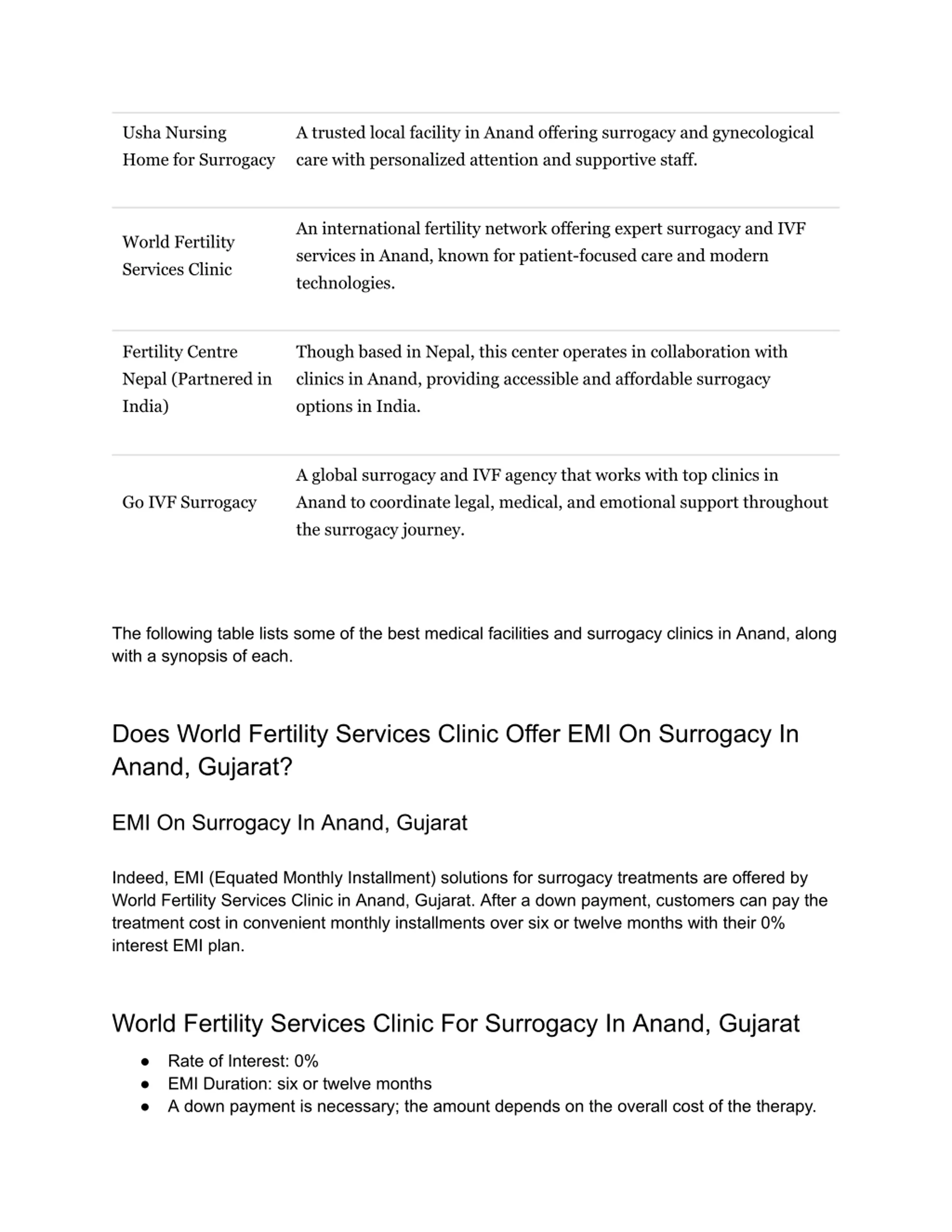 Usha Nursing Home for Surrogacy A trusted local facility in Anand offering surrogacy and gynecological care with personalized attention and supportive staff. An international fertility network offering expert surrogacy and IVF services in Anand, known for patient-focused care and modern technologies. World Fertility Services Clinic Fertility Centre Nepal (Partnered in India) Though based in Nepal, this center operates in collaboration with clinics in Anand, providing accessible and affordable surrogacy options in India. A global surrogacy and IVF agency that works with top clinics in Anand to coordinate legal, medical, and emotional support throughout the surrogacy journey. Go IVF Surrogacy The following table lists some of the best medical facilities and surrogacy clinics in Anand, along with a synopsis of each. Does World Fertility Services Clinic Offer EMI On Surrogacy In Anand, Gujarat? EMI On Surrogacy In Anand, Gujarat Indeed, EMI (Equated Monthly Installment) solutions for surrogacy treatments are offered by World Fertility Services Clinic in Anand, Gujarat. After a down payment, customers can pay the treatment cost in convenient monthly installments over six or twelve months with their 0% interest EMI plan. World Fertility Services Clinic For Surrogacy In Anand, Gujarat Rate of Interest: 0% EMI Duration: six or twelve months A down payment is necessary; the amount depends on the overall cost of the therapy.