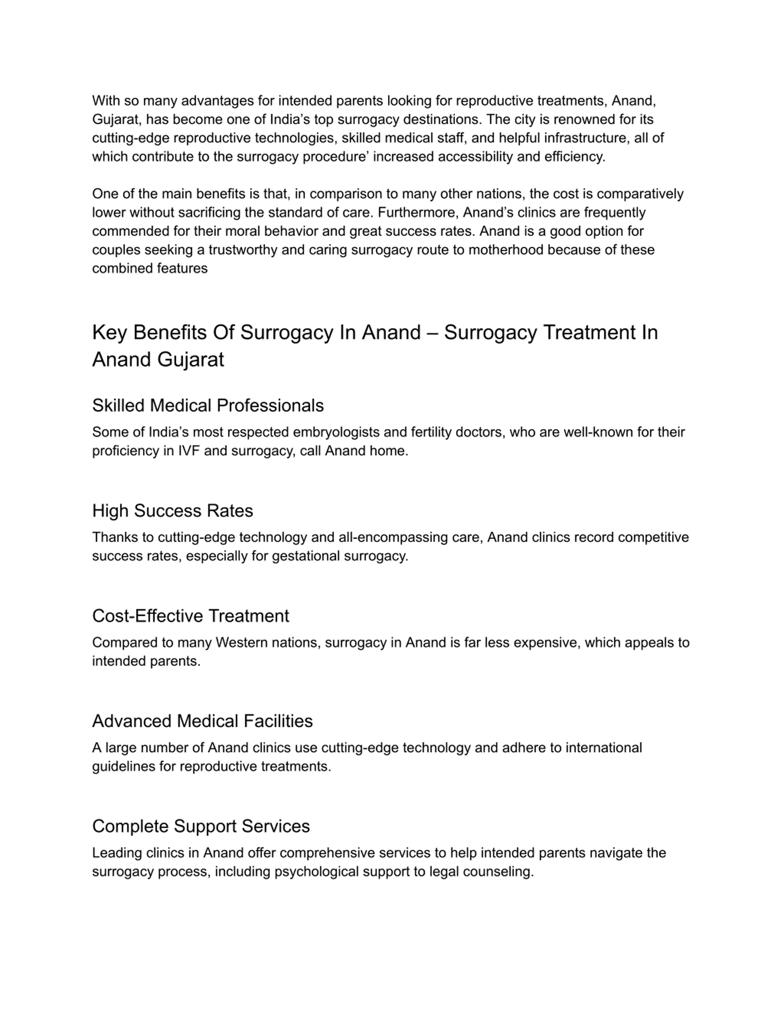 With so many advantages for intended parents looking for reproductive treatments, Anand, Gujarat, has become one of India s top surrogacy destinations. The city is renowned for its cutting-edge reproductive technologies, skilled medical staff, and helpful infrastructure, all of which contribute to the surrogacy procedure increased accessibility and efficiency. One of the main benefits is that, in comparison to many other nations, the cost is comparatively lower without sacrificing the standard of care. Furthermore, Anand s clinics are frequently commended for their moral behavior and great success rates. Anand is a good option for couples seeking a trustworthy and caring surrogacy route to motherhood because of these combined features Key Benefits Of Surrogacy In Anand Surrogacy Treatment In Anand Gujarat Skilled Medical Professionals Some of India s most respected embryologists and fertility doctors, who are well-known for their proficiency in IVF and surrogacy, call Anand home. High Success Rates Thanks to cutting-edge technology and all-encompassing care, Anand clinics record competitive success rates, especially for gestational surrogacy. Cost-Effective Treatment Compared to many Western nations, surrogacy in Anand is far less expensive, which appeals to intended parents. Advanced Medical Facilities A large number of Anand clinics use cutting-edge technology and adhere to international guidelines for reproductive treatments. Complete Support Services Leading clinics in Anand offer comprehensive services to help intended parents navigate the surrogacy process, including psychological support to legal counseling.