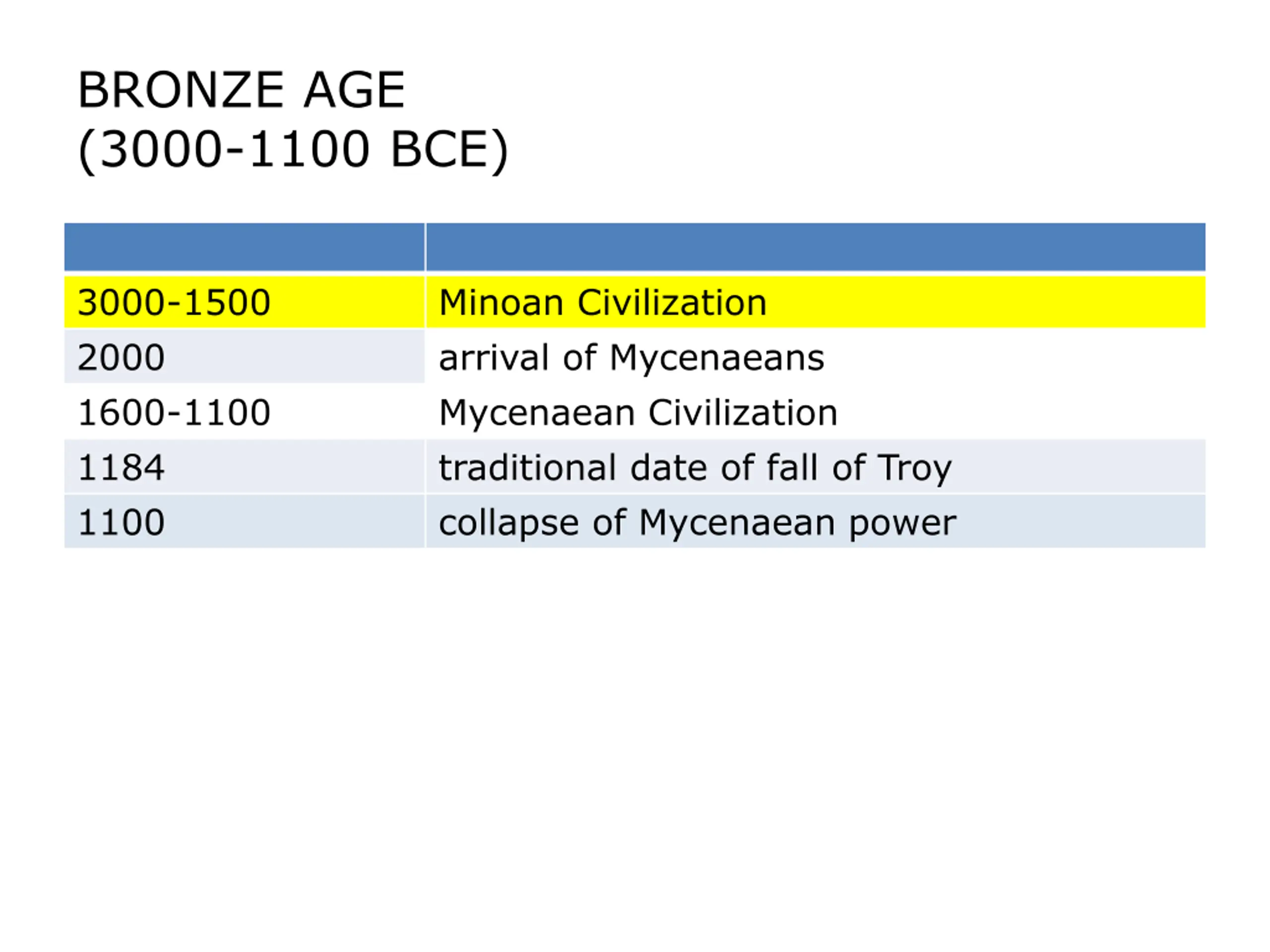 BRONZE AGE (3000-1100 BCE) 3000-1500 2000 1600-1100 1184 1100 Minoan Civilization arrival of Mycenaeans Mycenaean Civilization traditional date of fall of Troy collapse of Mycenaean power
