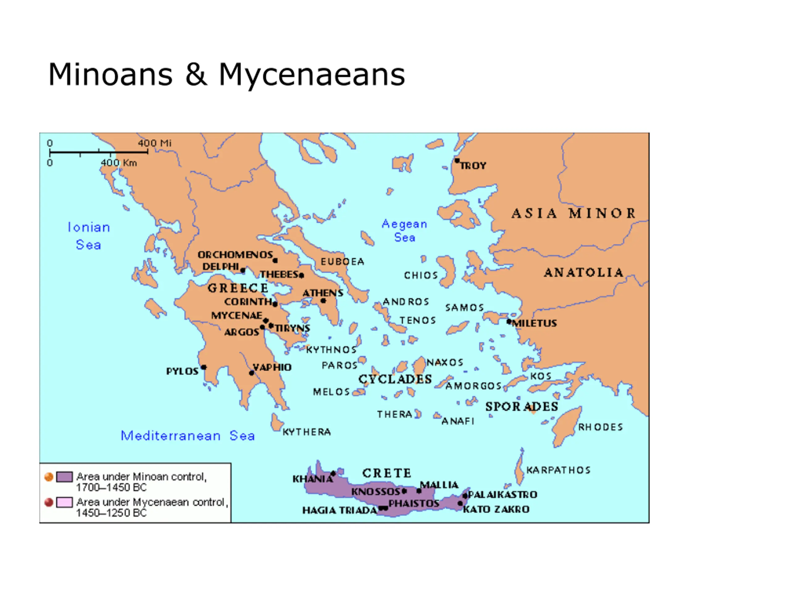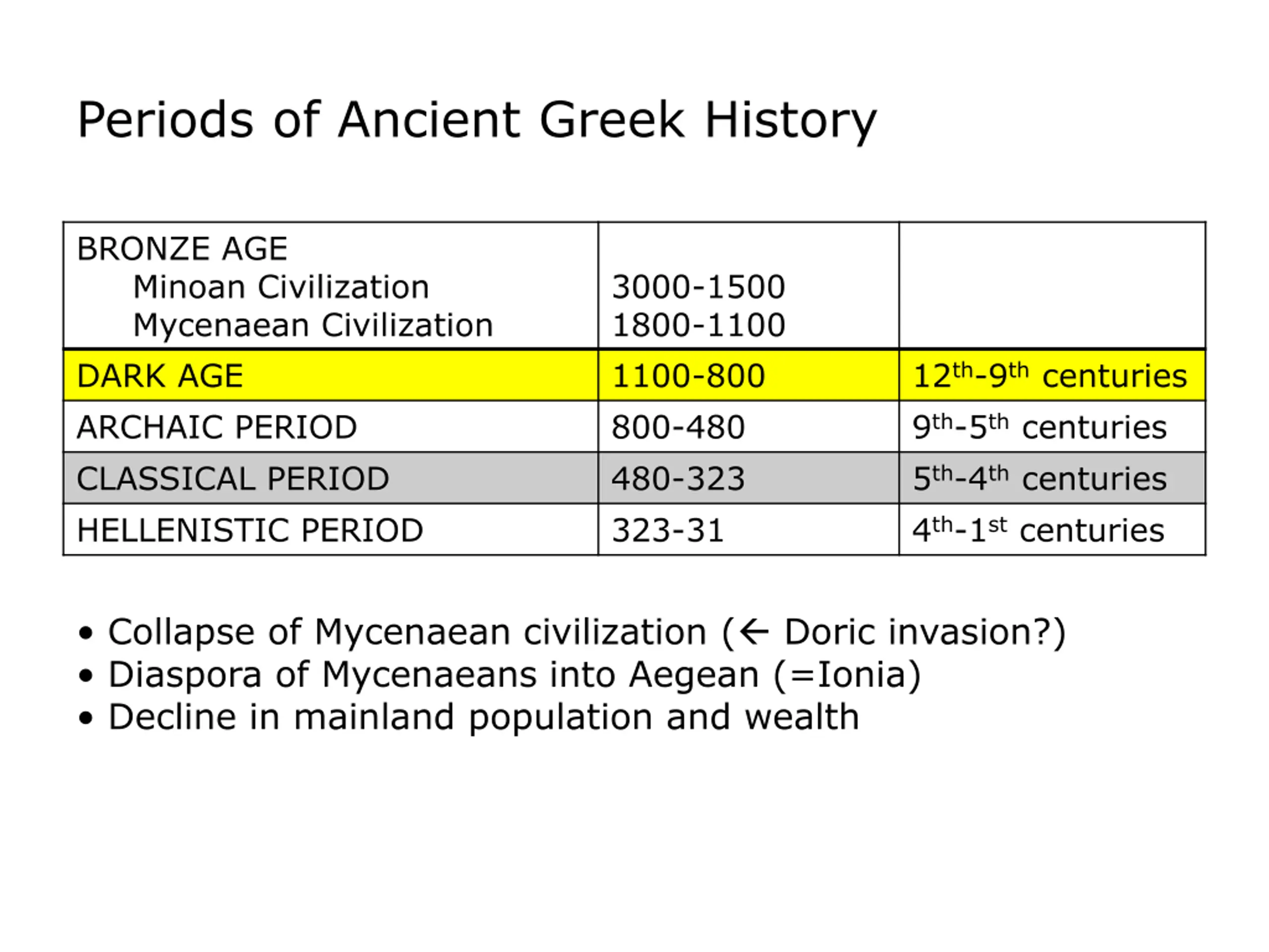 Periods of Ancient Greek History BRONZE AGE Minoan Civilization Mycenaean Civilization DARK AGE ARCHAIC PERIOD CLASSICAL PERIOD HELLENISTIC PERIOD 3000-1500 1800-1100 1100-800 800-480 480-323 323-31 12th-9thcenturies 9th-5thcenturies 5th-4thcenturies 4th-1stcenturies Collapse of Mycenaean civilization ( Doric invasion?) Diaspora of Mycenaeans into Aegean (=Ionia) Decline in mainland population and wealth