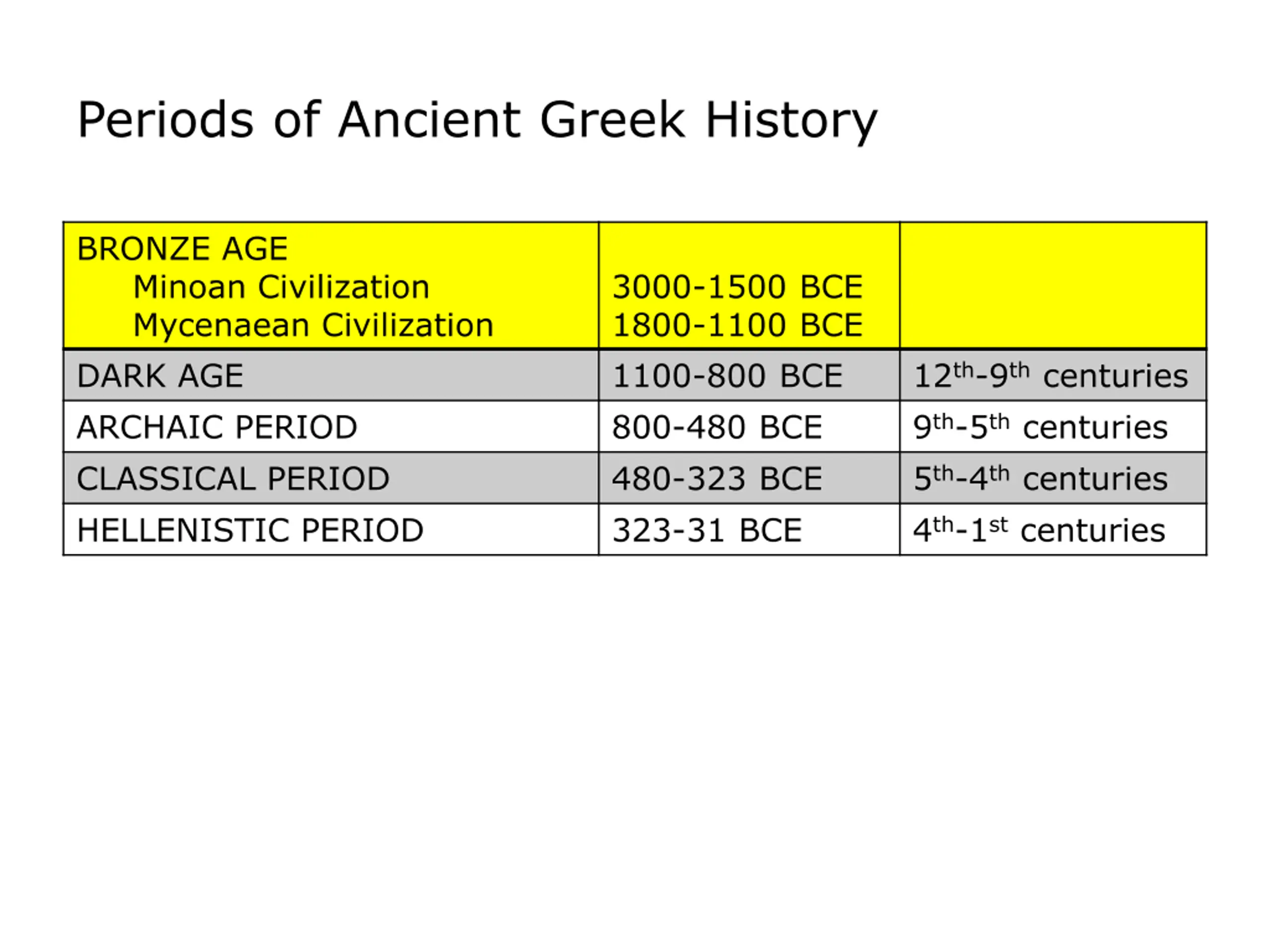 Periods of Ancient Greek History BRONZE AGE Minoan Civilization Mycenaean Civilization DARK AGE ARCHAIC PERIOD CLASSICAL PERIOD HELLENISTIC PERIOD 3000-1500 BCE 1800-1100 BCE 1100-800 BCE 800-480 BCE 480-323 BCE 323-31 BCE 12th-9thcenturies 9th-5thcenturies 5th-4thcenturies 4th-1stcenturies