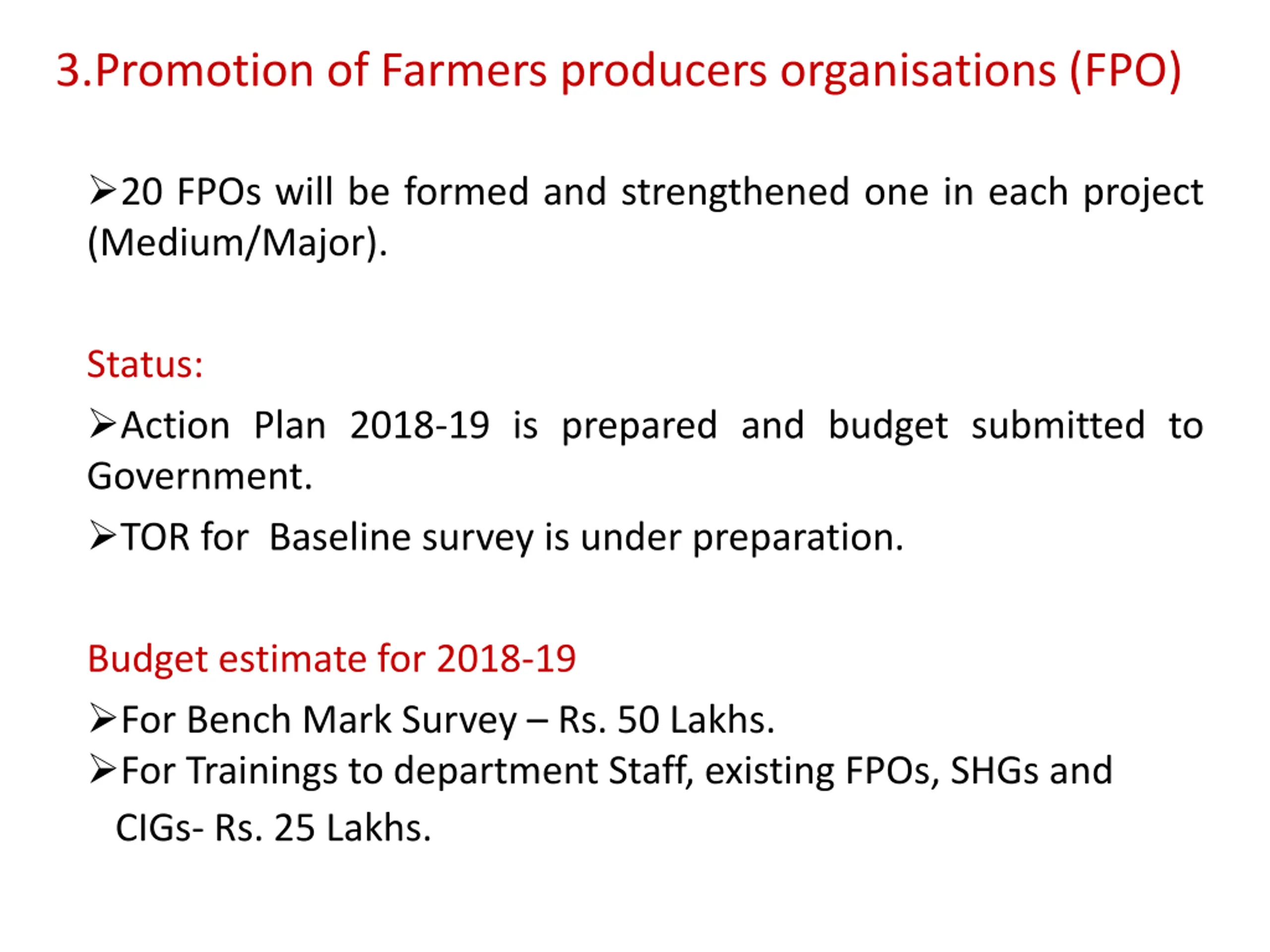 3.Promotion of Farmers producers organisations (FPO) 20 FPOs will be formed and strengthened one in each project (Medium/Major). Status: Action Plan 2018-19 is prepared and budget submitted to Government. TOR for Baseline survey is under preparation. Budget estimate for 2018-19 For Bench Mark Survey Rs. 50 Lakhs. For Trainings to department Staff, existing FPOs, SHGs and CIGs- Rs. 25 Lakhs.