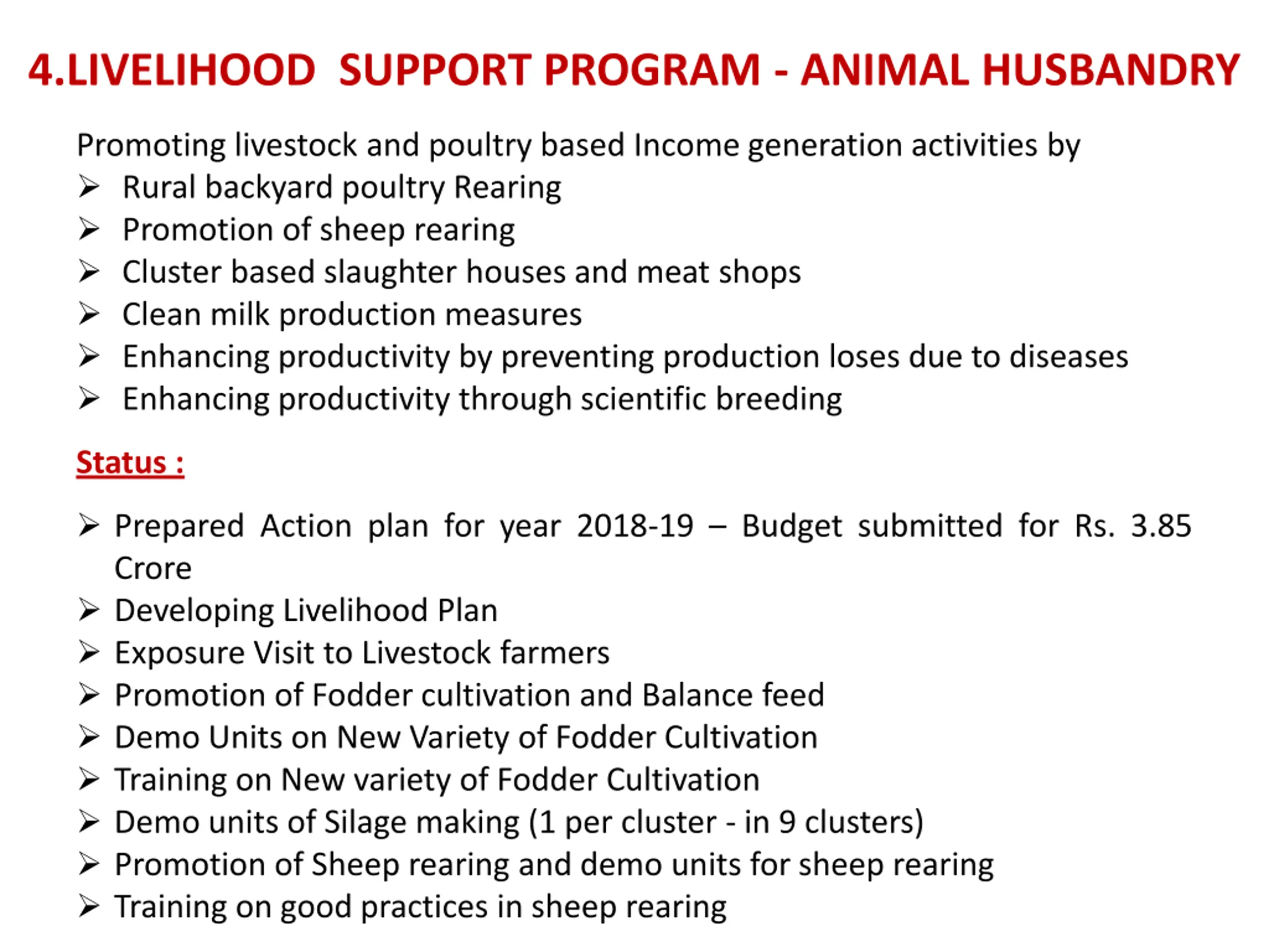 4.LIVELIHOOD SUPPORT PROGRAM - ANIMAL HUSBANDRY Promoting livestock and poultry based Income generation activities by Rural backyard poultry Rearing Promotion of sheep rearing Cluster based slaughter houses and meat shops Clean milk production measures Enhancing productivity by preventing production loses due to diseases Enhancing productivity through scientific breeding Status : Prepared Action plan for year 2018-19 Budget submitted for Rs. 3.85 Crore Developing Livelihood Plan Exposure Visit to Livestock farmers Promotion of Fodder cultivation and Balance feed Demo Units on New Variety of Fodder Cultivation Training on New variety of Fodder Cultivation Demo units of Silage making (1 per cluster - in 9 clusters) Promotion of Sheep rearing and demo units for sheep rearing Training on good practices in sheep rearing