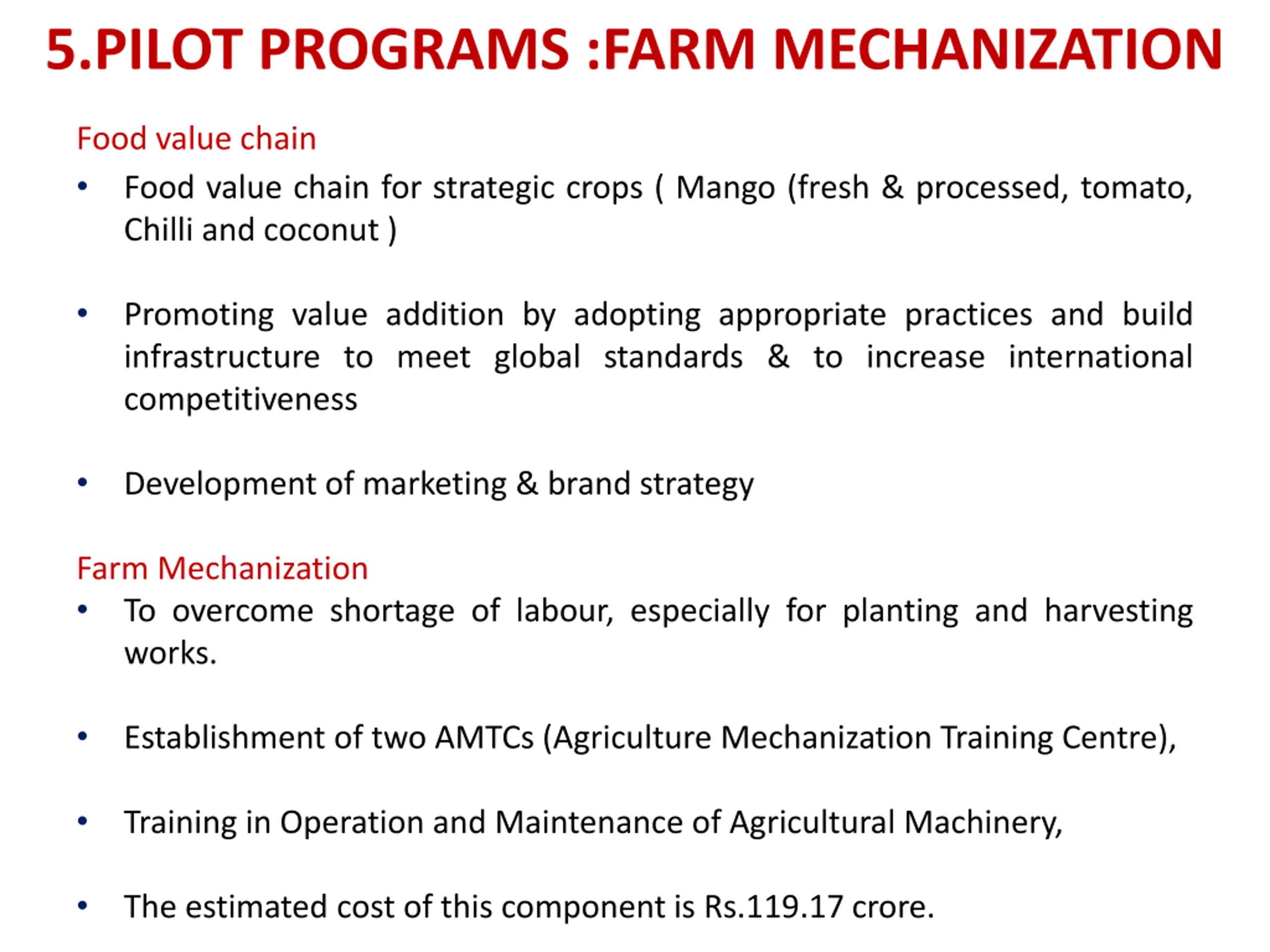 5.PILOT PROGRAMS :FARM MECHANIZATION Food value chain Food value chain for strategic crops ( Mango (fresh & processed, tomato, Chilli and coconut ) Promoting value addition by adopting appropriate practices and build infrastructure to meet global standards & to increase international competitiveness Development of marketing & brand strategy Farm Mechanization To overcome shortage of labour, especially for planting and harvesting works. Establishment of two AMTCs (Agriculture Mechanization Training Centre), Training in Operation and Maintenance of Agricultural Machinery, The estimated cost of this component is Rs.119.17 crore.