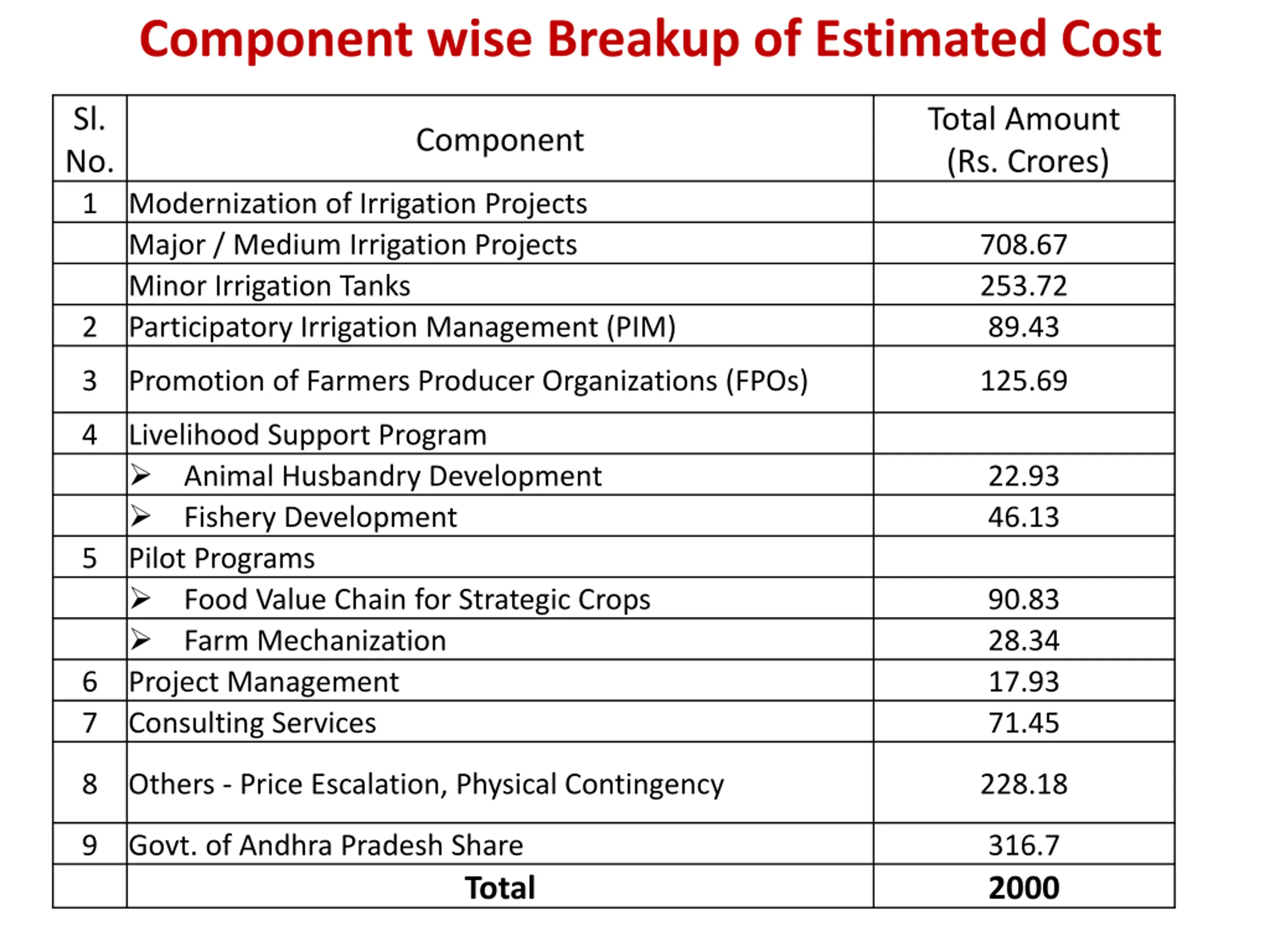 Component wise Breakup of Estimated Cost Sl. No. 1 Total Amount (Rs. Crores) Component Modernization of Irrigation Projects Major / Medium Irrigation Projects Minor Irrigation Tanks Participatory Irrigation Management (PIM) 708.67 253.72 89.43 2 3 Promotion of Farmers Producer Organizations (FPOs) 125.69 4 Livelihood Support Program Animal Husbandry Development Fishery Development Pilot Programs Food Value Chain for Strategic Crops Farm Mechanization Project Management Consulting Services 22.93 46.13 5 90.83 28.34 17.93 71.45 6 7 8 Others - Price Escalation, Physical Contingency 228.18 9 Govt. of Andhra Pradesh Share 316.7 2000 Total