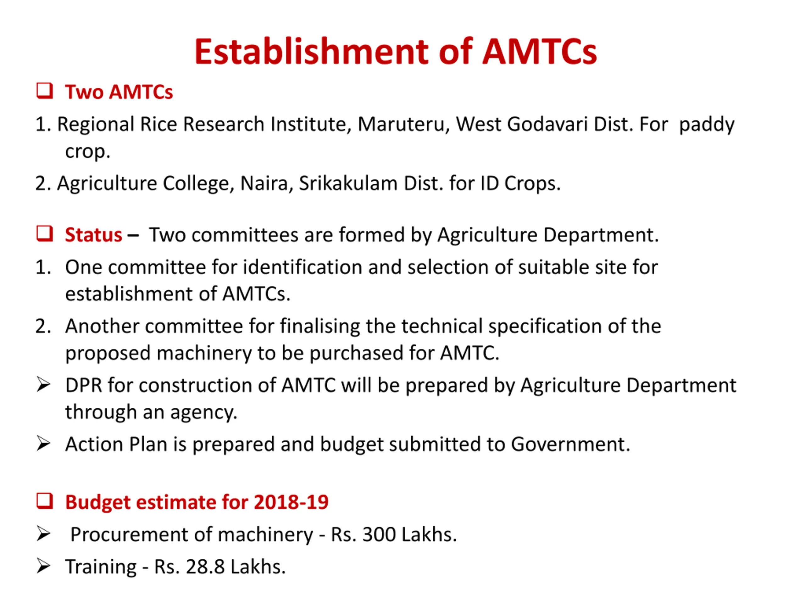 Establishment of AMTCs Two AMTCs 1. Regional Rice Research Institute, Maruteru, West Godavari Dist. For paddy crop. 2. Agriculture College, Naira, Srikakulam Dist. for ID Crops. Status Two committees are formed by Agriculture Department. 1. One committee for identification and selection of suitable site for establishment of AMTCs. 2. Another committee for finalising the technical specification of the proposed machinery to be purchased for AMTC. DPR for construction of AMTC will be prepared by Agriculture Department through an agency. Action Plan is prepared and budget submitted to Government. Budget estimate for 2018-19 Procurement of machinery - Rs. 300 Lakhs. Training - Rs. 28.8 Lakhs.