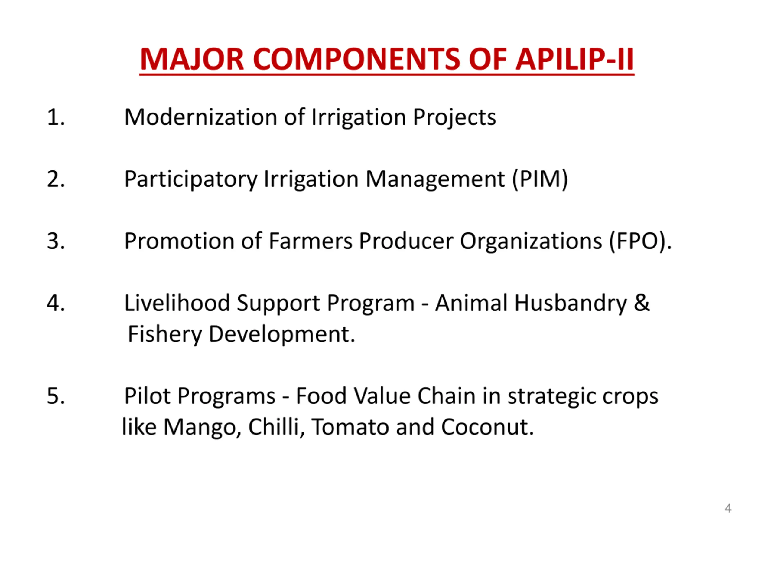 MAJOR COMPONENTS OF APILIP-II 1. Modernization of Irrigation Projects 2. Participatory Irrigation Management (PIM) 3. Promotion of Farmers Producer Organizations (FPO). 4. Fishery Development. Livelihood Support Program - Animal Husbandry & 5. like Mango, Chilli, Tomato and Coconut. Pilot Programs - Food Value Chain in strategic crops 4