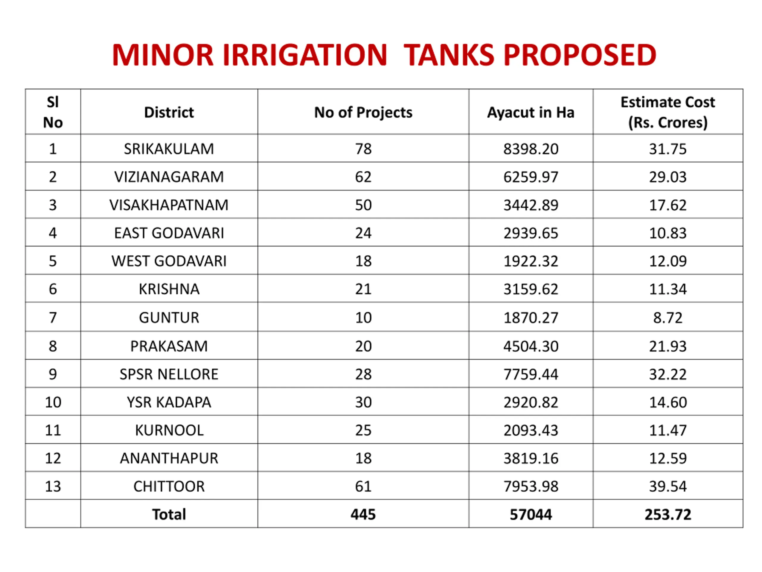 MINOR IRRIGATION TANKS PROPOSED Sl No Estimate Cost (Rs. Crores) District No of Projects Ayacut in Ha 1 SRIKAKULAM 78 8398.20 31.75 2 VIZIANAGARAM 62 6259.97 29.03 3 VISAKHAPATNAM 50 3442.89 17.62 4 EAST GODAVARI 24 2939.65 10.83 5 WEST GODAVARI 18 1922.32 12.09 6 KRISHNA 21 3159.62 11.34 7 GUNTUR 10 1870.27 8.72 8 PRAKASAM 20 4504.30 21.93 9 SPSR NELLORE 28 7759.44 32.22 10 YSR KADAPA 30 2920.82 14.60 11 KURNOOL 25 2093.43 11.47 12 ANANTHAPUR 18 3819.16 12.59 13 CHITTOOR 61 7953.98 39.54 Total 445 57044 253.72