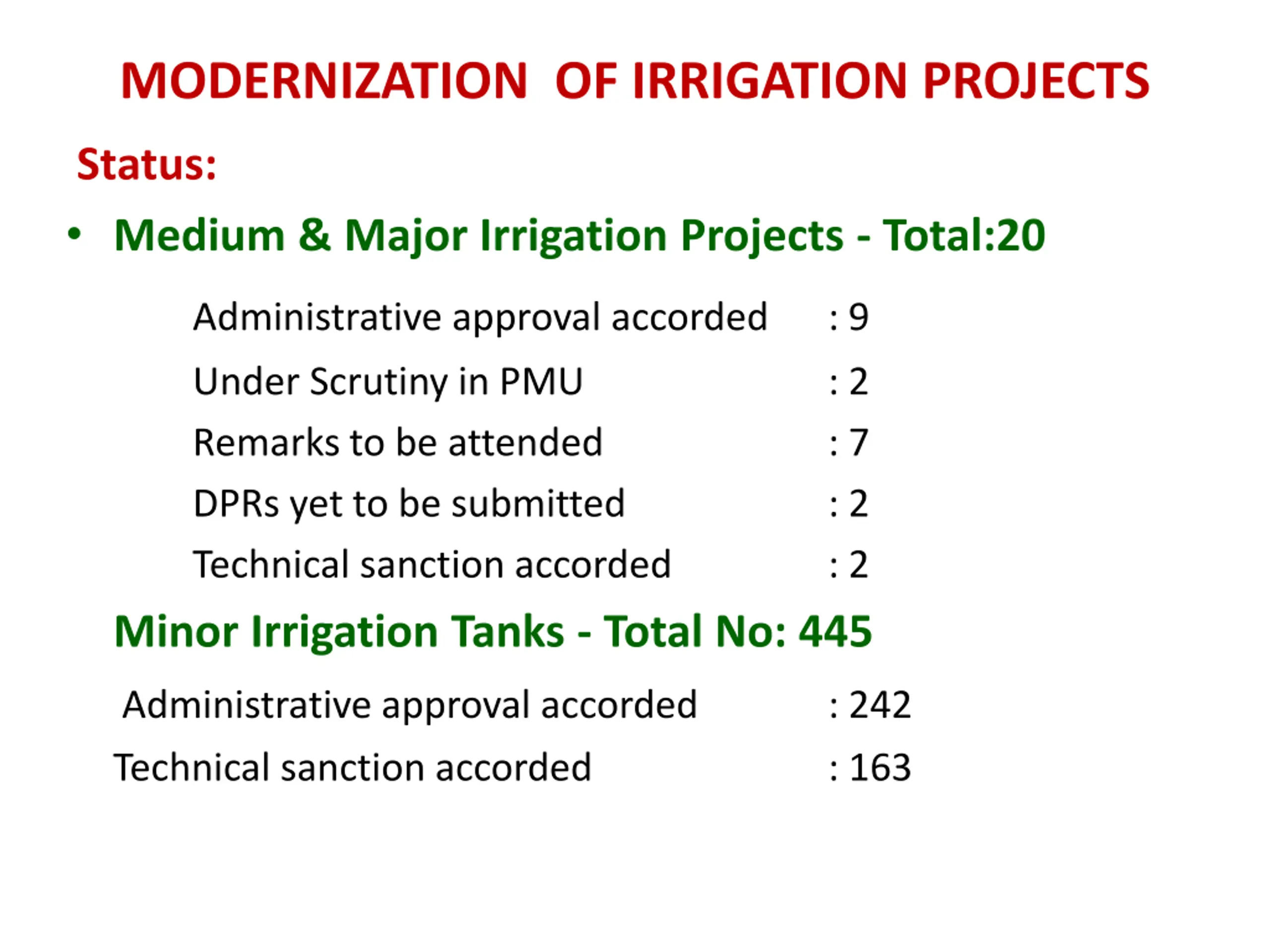 MODERNIZATION OF IRRIGATION PROJECTS Status: Medium & Major Irrigation Projects - Total:20 Administrative approval accorded Under Scrutiny in PMU Remarks to be attended DPRs yet to be submitted Technical sanction accorded : 9 : 2 : 7 : 2 : 2 Minor Irrigation Tanks - Total No: 445 Administrative approval accorded Technical sanction accorded : 242 : 163