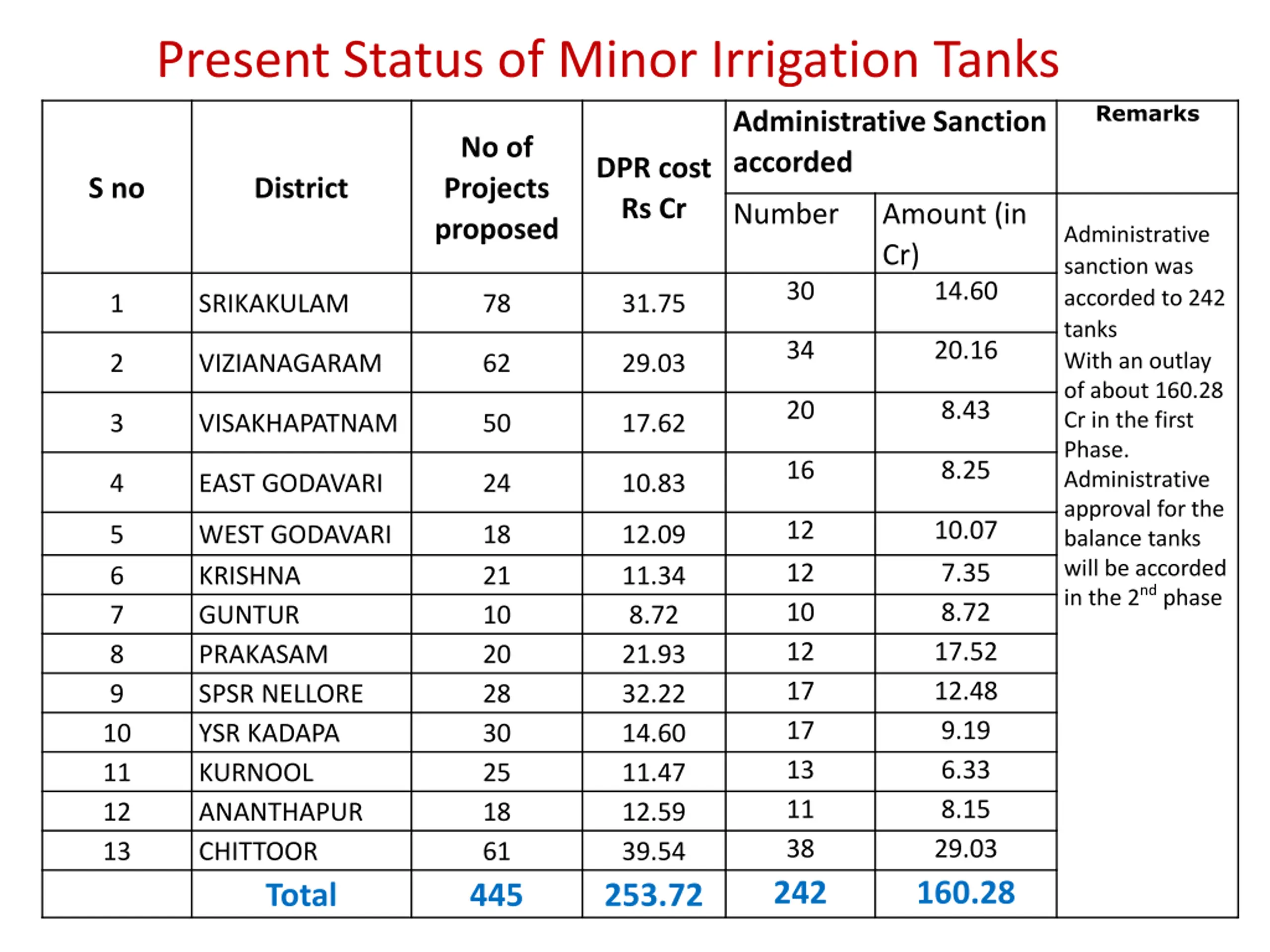 Present Status of Minor Irrigation Tanks Remarks Administrative Sanction accorded No of Projects proposed DPR cost Rs Cr S no District Number Amount (in Cr) 14.60 Administrative sanction was accorded to 242 tanks With an outlay of about 160.28 Cr in the first Phase. Administrative approval for the balance tanks will be accorded in the 2nd phase 30 1 SRIKAKULAM 78 31.75 34 20.16 2 VIZIANAGARAM 62 29.03 20 8.43 3 VISAKHAPATNAM 50 17.62 16 8.25 4 EAST GODAVARI 24 10.83 12 10.07 5 6 7 8 9 10 11 12 13 WEST GODAVARI KRISHNA GUNTUR PRAKASAM SPSR NELLORE YSR KADAPA KURNOOL ANANTHAPUR CHITTOOR Total 18 21 10 20 28 30 25 18 61 445 12.09 11.34 8.72 21.93 32.22 14.60 11.47 12.59 39.54 253.72 12 10 12 17 17 13 11 38 242 7.35 8.72 17.52 12.48 9.19 6.33 8.15 29.03 160.28