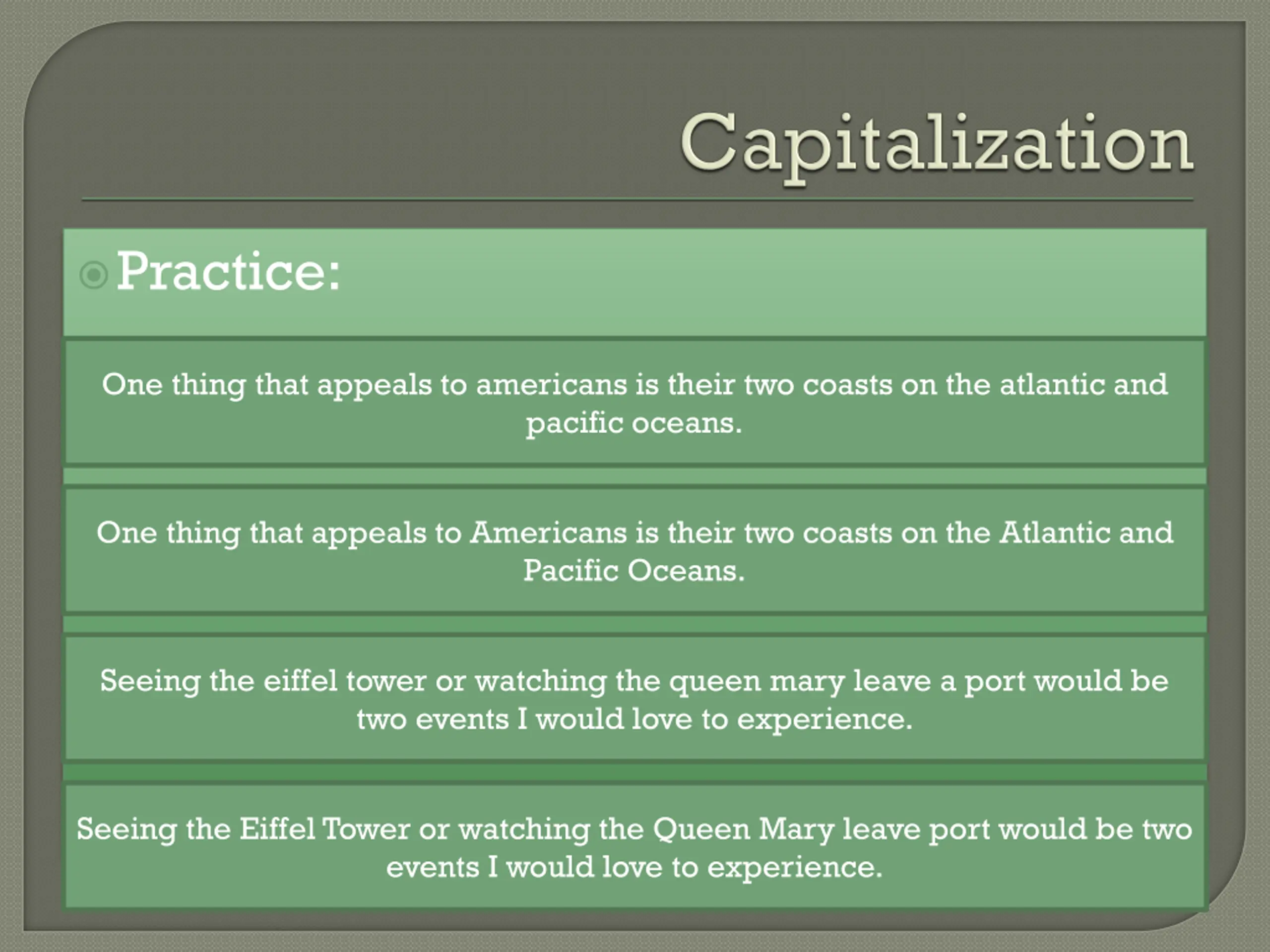 Practice: One thing that appeals to americans is their two coasts on the atlantic and pacific oceans. One thing that appeals to Americans is their two coasts on the Atlantic and Pacific Oceans. Seeing the eiffel tower or watching the queen mary leave a port would be two events I would love to experience. Seeing the Eiffel Tower or watching the Queen Mary leave port would be two events I would love to experience.