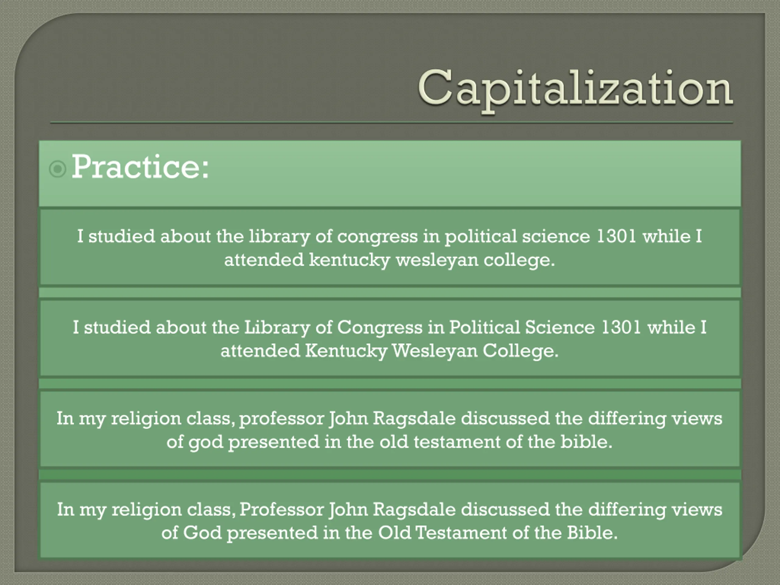 Practice: I studied about the library of congress in political science 1301 while I attended kentucky wesleyan college. I studied about the Library of Congress in Political Science 1301 while I attended Kentucky Wesleyan College. In my religion class, professor John Ragsdale discussed the differing views of god presented in the old testament of the bible. In my religion class, Professor John Ragsdale discussed the differing views of God presented in the Old Testament of the Bible.