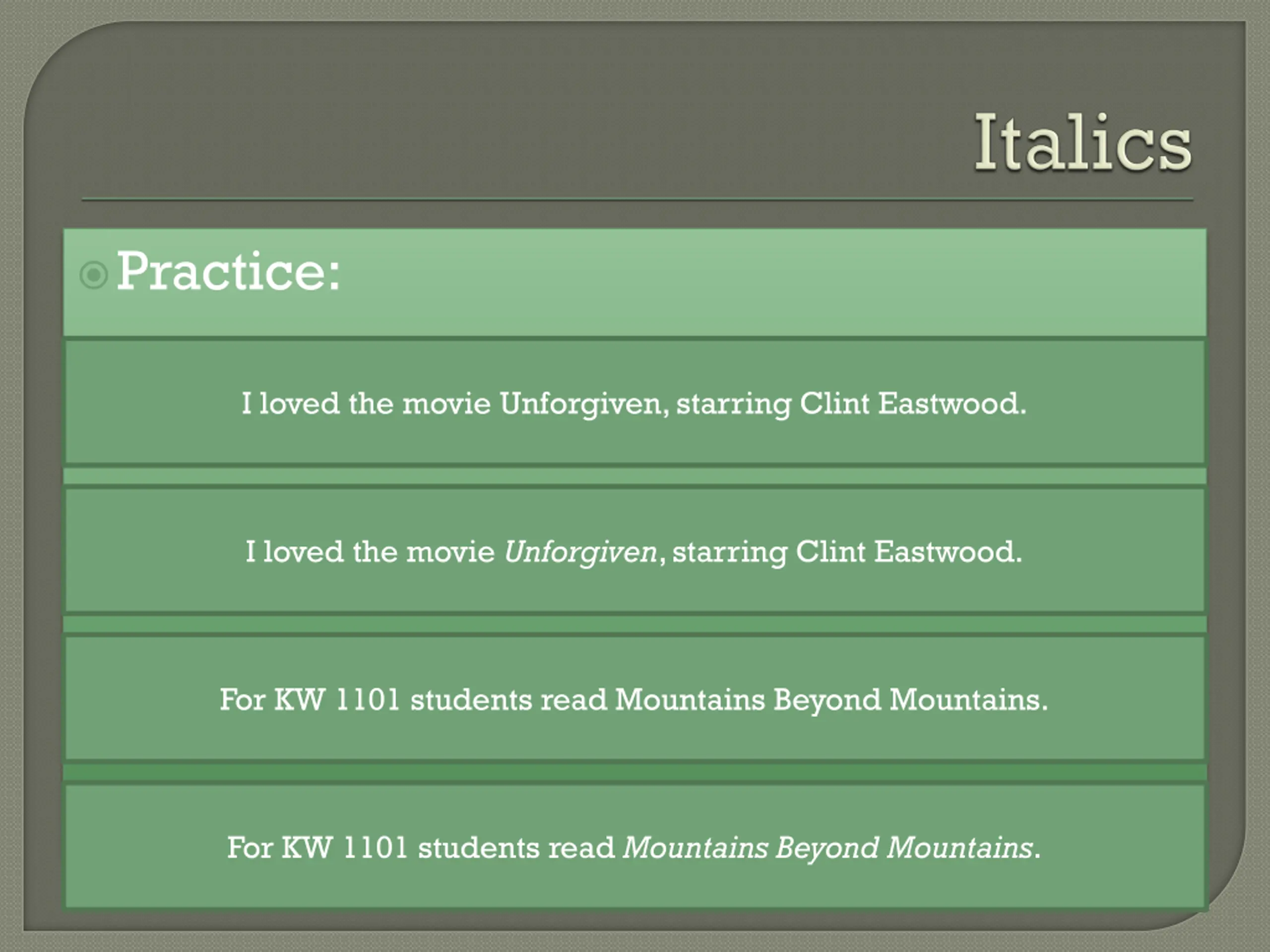 Practice: I loved the movie Unforgiven, starring Clint Eastwood. I loved the movie Unforgiven, starring Clint Eastwood. For KW 1101 students read Mountains Beyond Mountains. For KW 1101 students read Mountains Beyond Mountains.