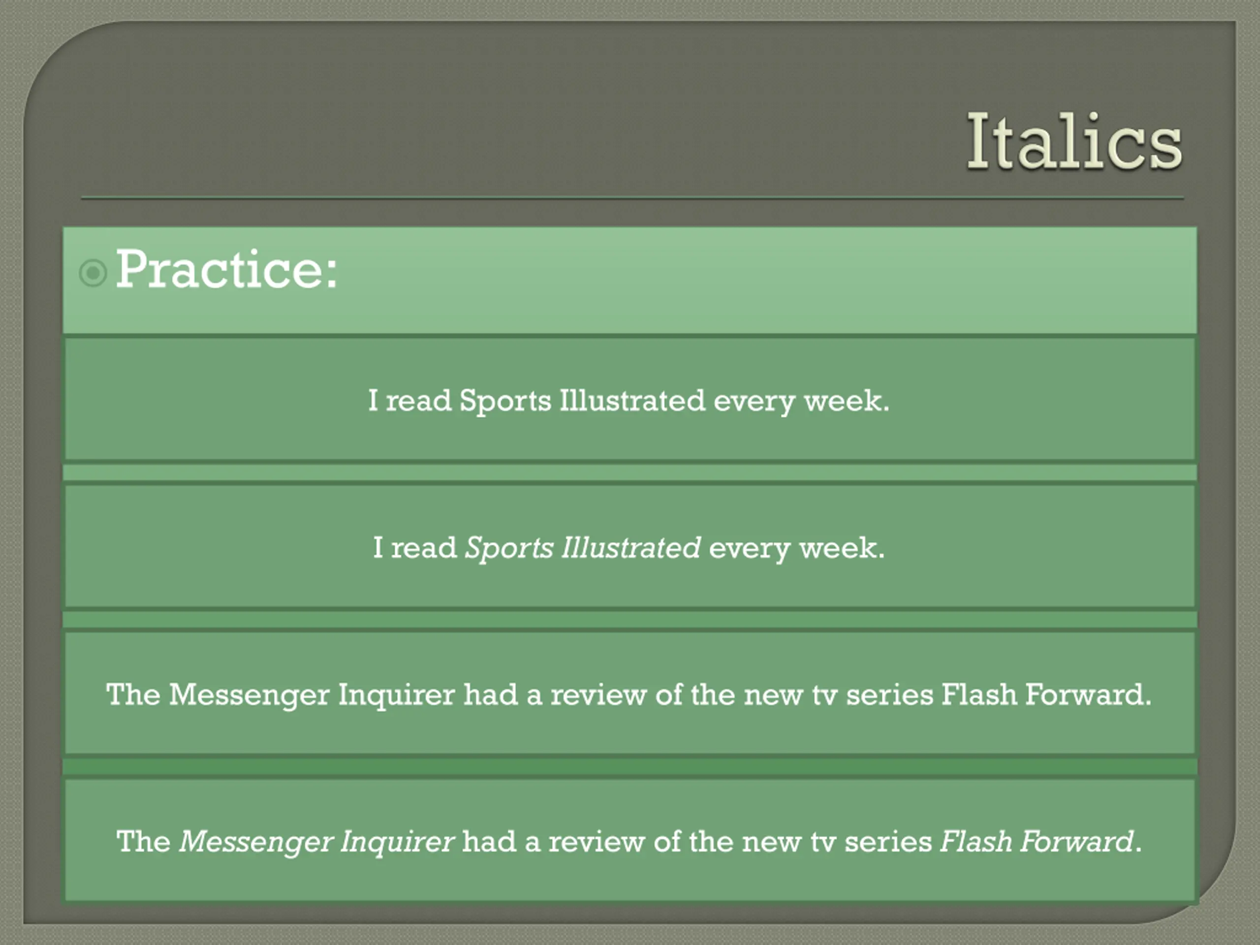 Practice: I read Sports Illustrated every week. I read Sports Illustrated every week. The Messenger Inquirer had a review of the new tv series Flash Forward. The Messenger Inquirer had a review of the new tv series Flash Forward.