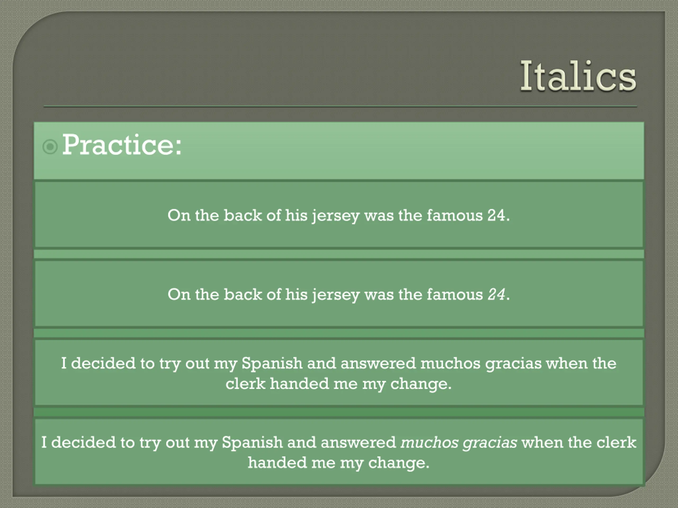 Practice: On the back of his jersey was the famous 24. On the back of his jersey was the famous 24. I decided to try out my Spanish and answered muchos gracias when the clerk handed me my change. I decided to try out my Spanish and answered muchos gracias when the clerk handed me my change.