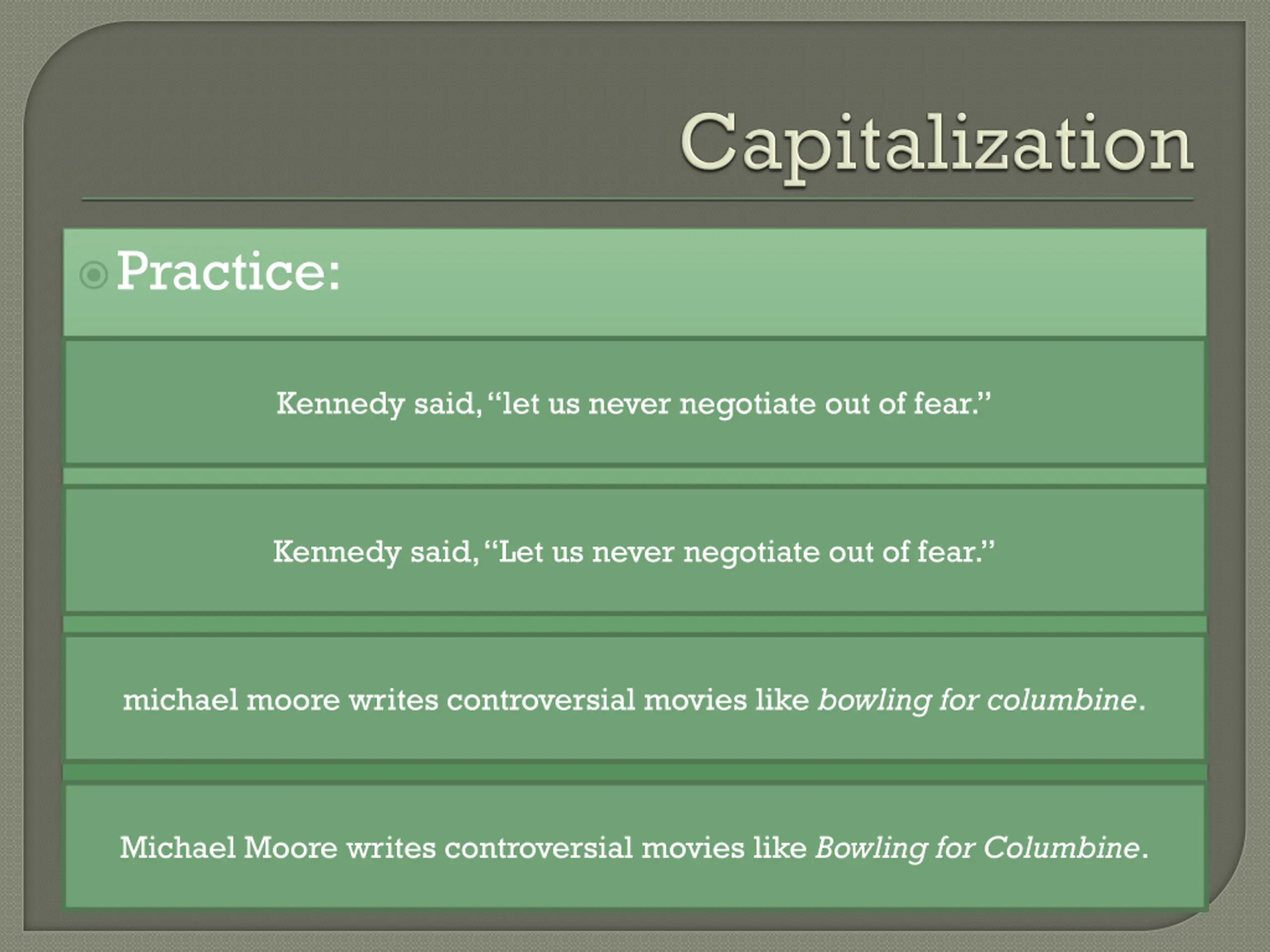 Practice: Kennedy said, let us never negotiate out of fear. Kennedy said, Let us never negotiate out of fear. michael moore writes controversial movies like bowling for columbine. Michael Moore writes controversial movies like Bowling for Columbine.
